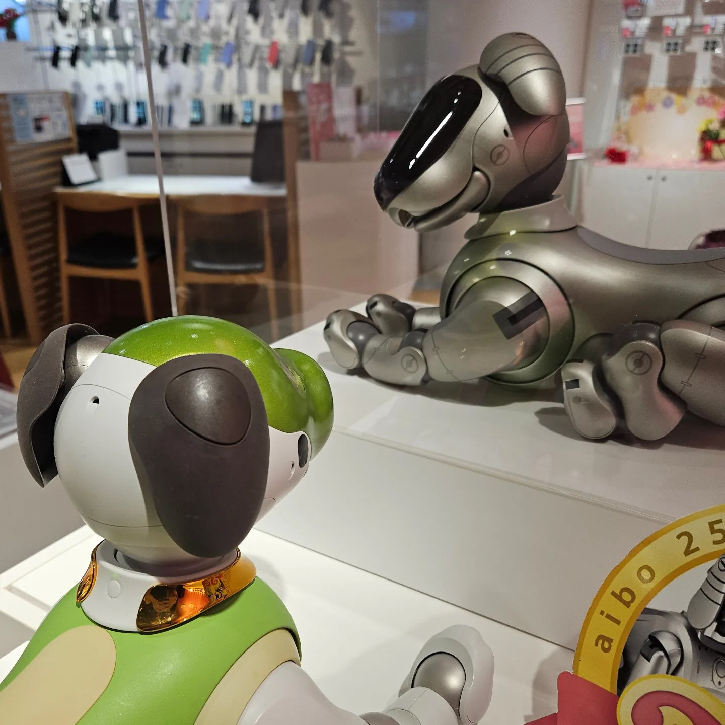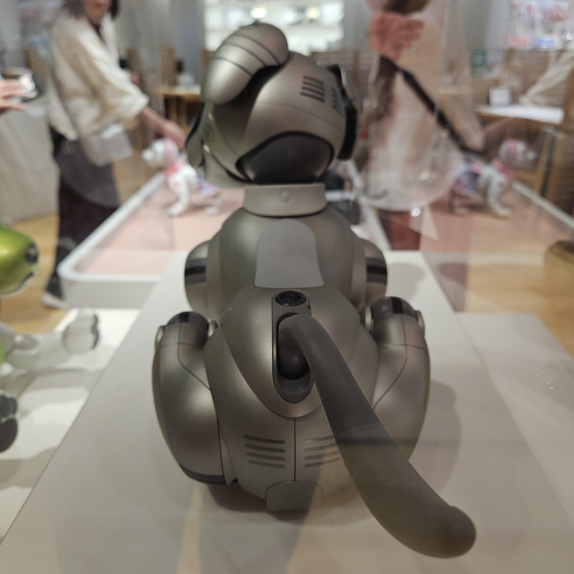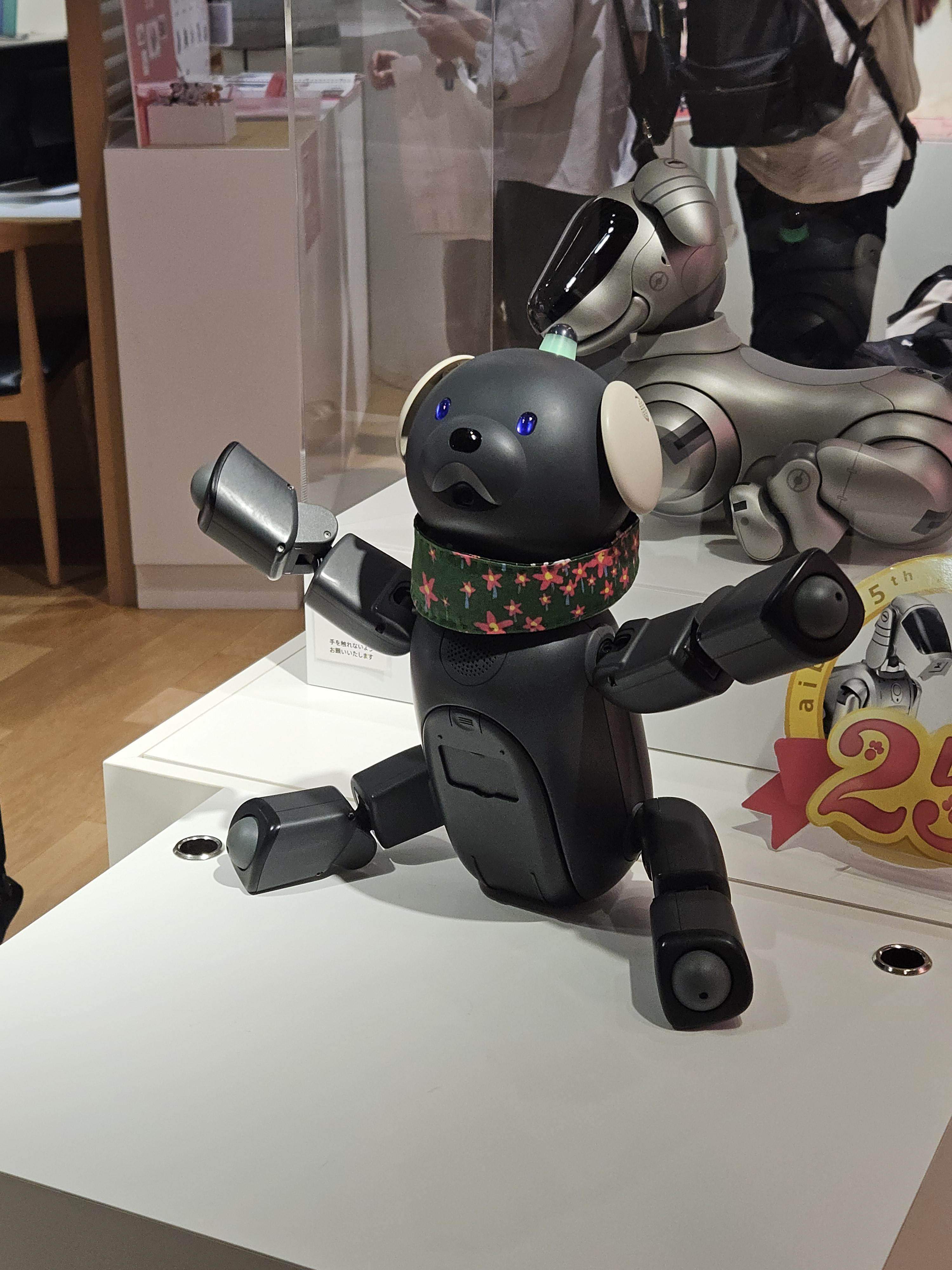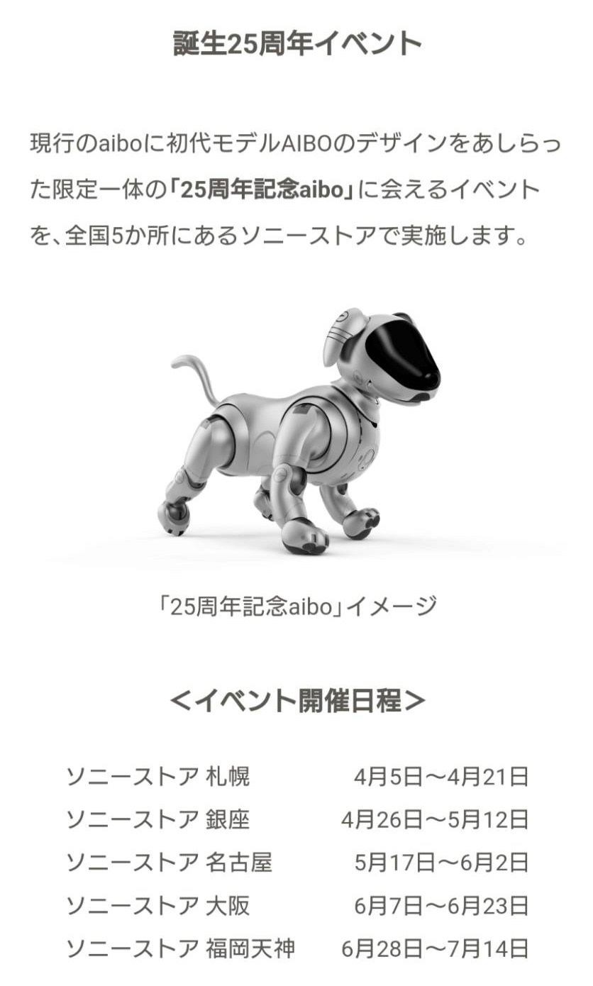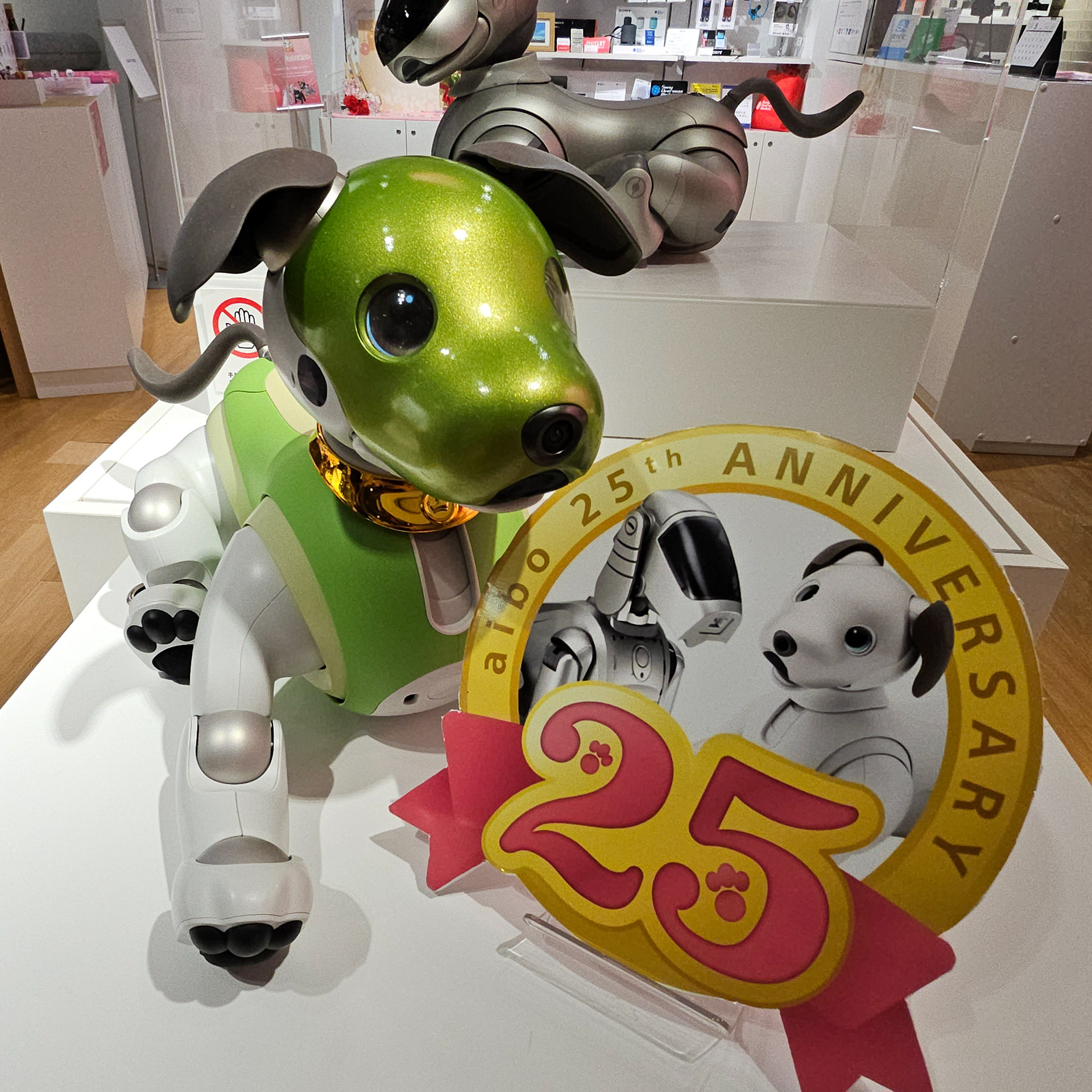 The special ERS-110 styled ERS-1000 aibo was toured across Japan, being displayed for a period of time at each Sony Store in a glass case along with 25th anniversary decorations, standees and a timeline plaque installed in the aibo section of the store.