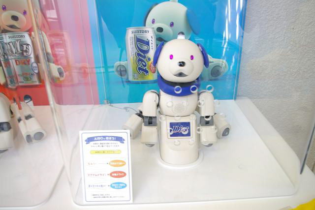 Suntory aibo is a model 311B that was distributed as a prize by Suntory. Its ears and neck donuts come in three colors: red, blue, and yellow, and it comes with software that lets it imitate drinking beer. They are rare.