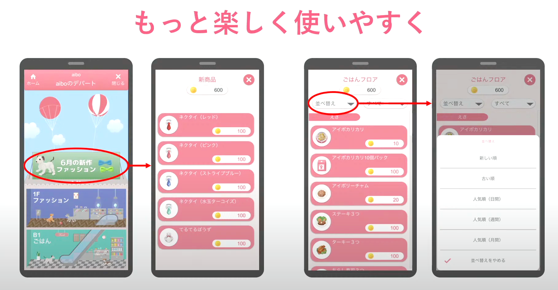 My aiboアプリには、速度向上、2フロアのストア、そしてバーチャルaibo用ウェアラブルデバイスの追加など、様々な改良が行われました。 aibo 1台に保存できる写真の数が1000枚に増加しました。アプリにバースデーケーキが登場しました。