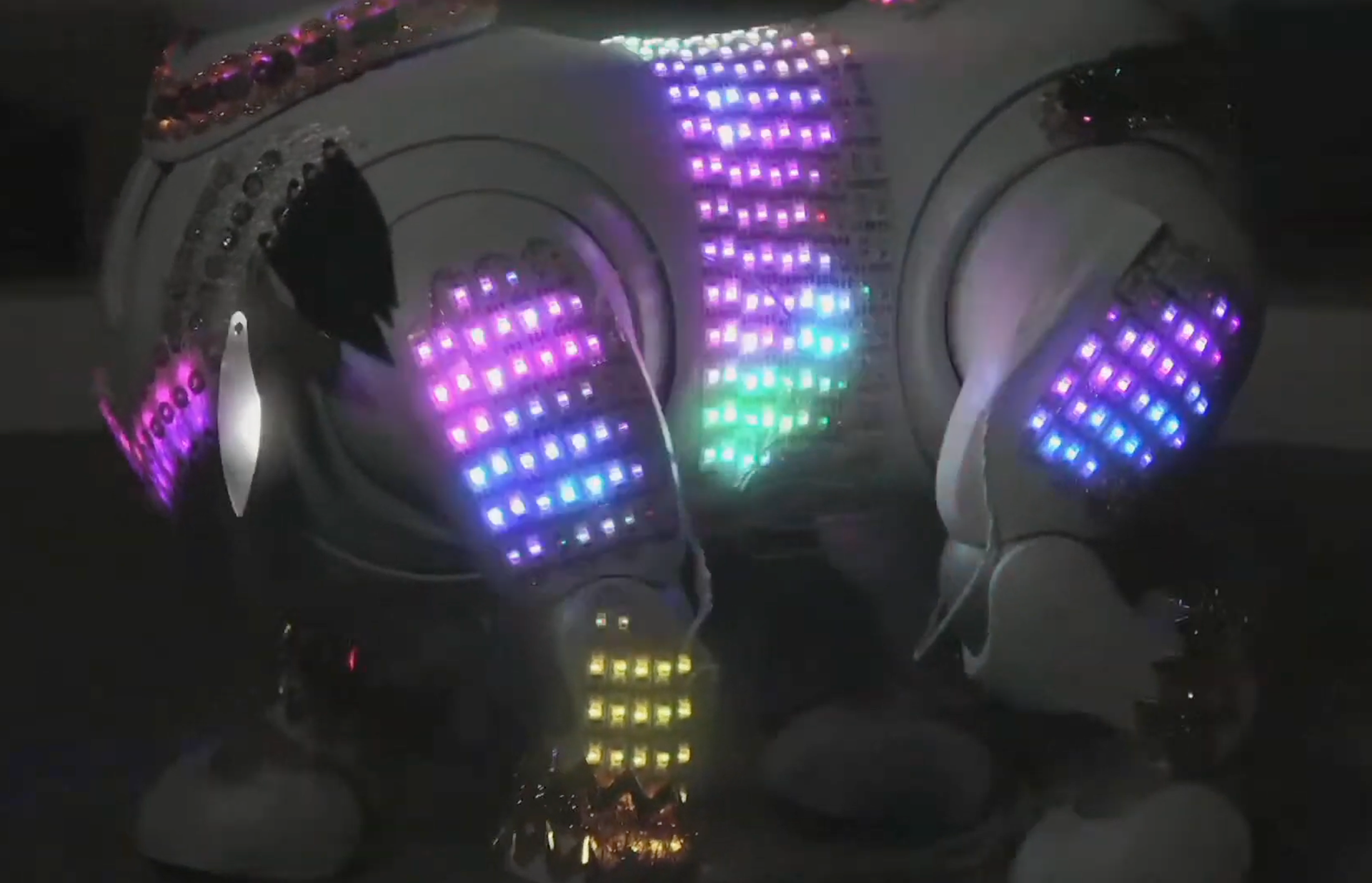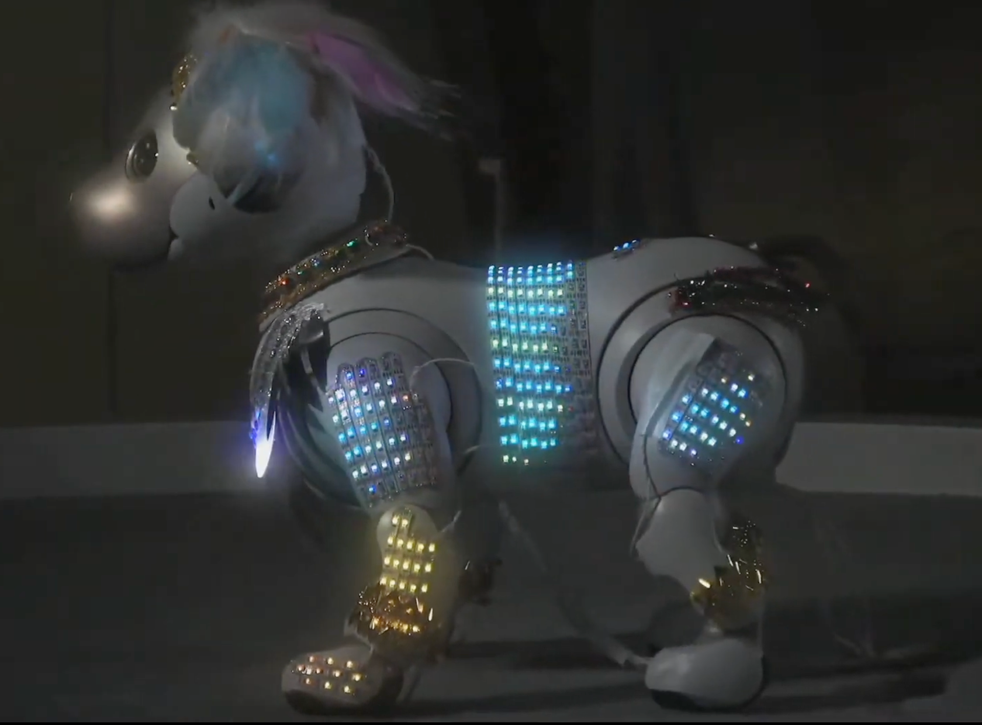 LED衣装をまとったaiboと、サンバ・デ・ジャネイロのプレミアムプランのダンスを披露しました。