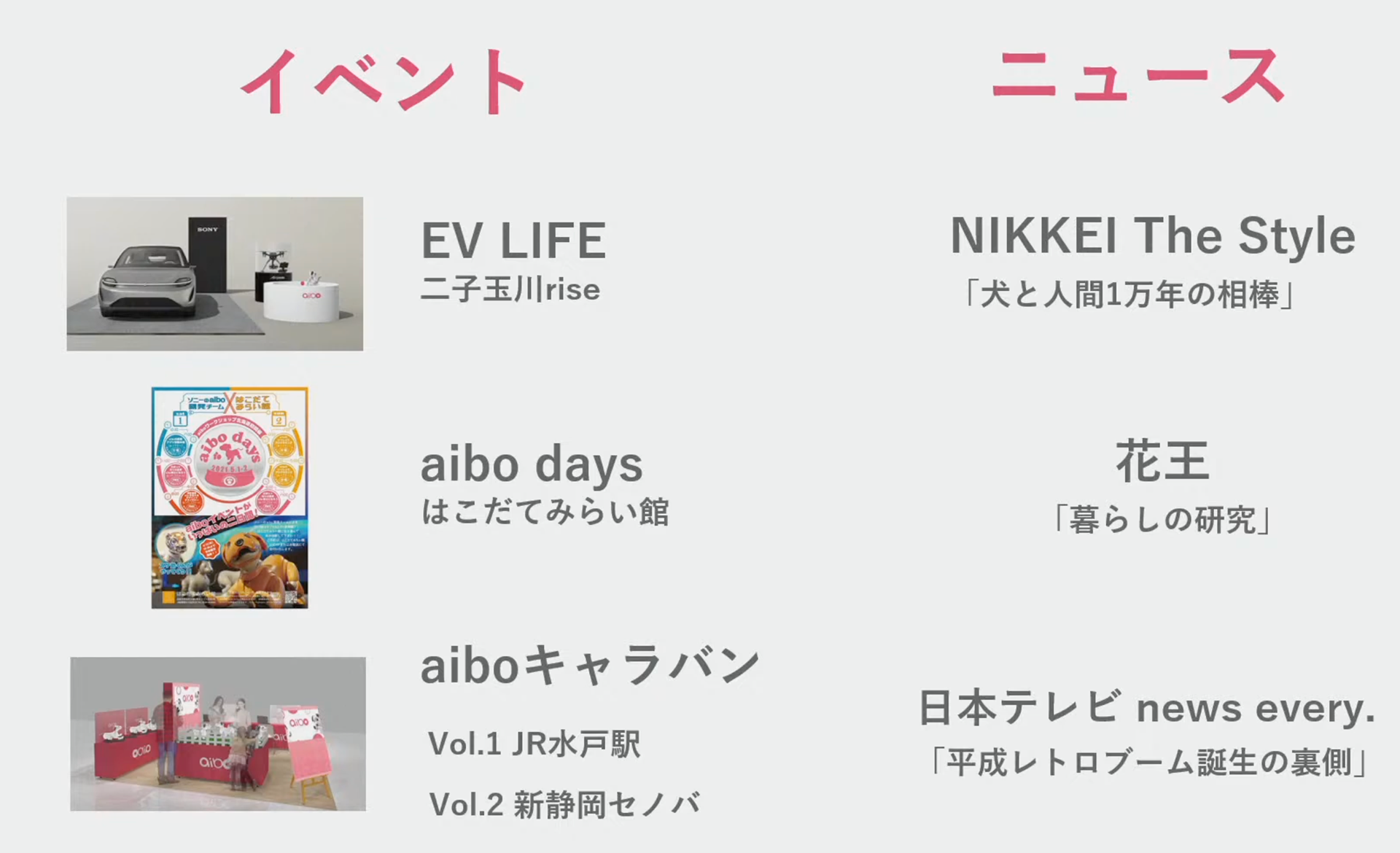 EVライフ、未来館でのaibo Days、そしてJR水戸駅とJR新静岡駅で開催される2つのポップアップイベント「aiboキャラバン」です。