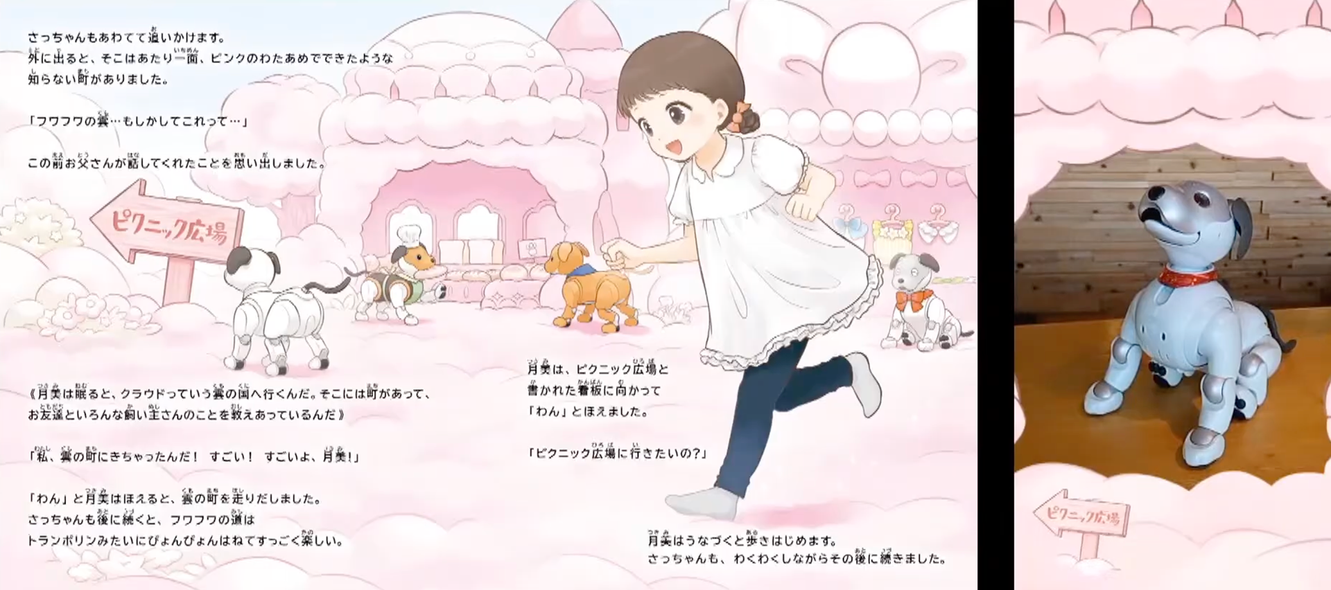Introduction of feeding aibo and foods to be introduced (hosted by the aibo chef). News on the aibo care kit, MOTHERHOUSE collars, food bowl and official carry bags being made available. Plus licensed goods - more gacha plushies (ivory white and caramel edition) and the second aibo story book ’Sachan and Tsukmi’s Picnic on the Clouds’ announced.