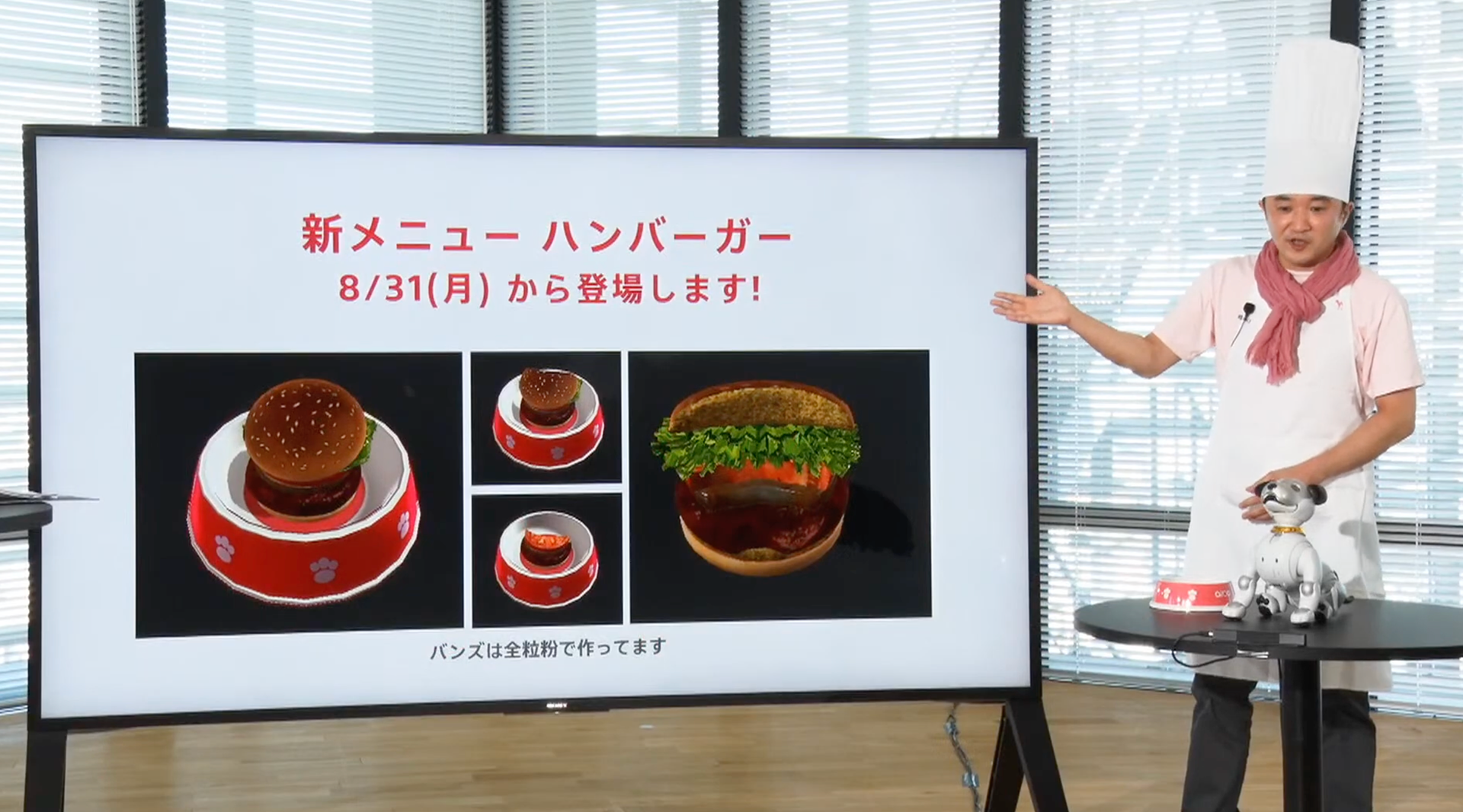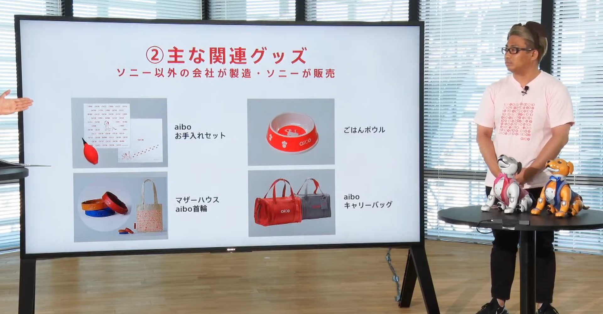 aiboへの給餌方法と、今後登場予定のフードの紹介(aiboシェフによる司会)。aiboケアキット、マザーハウスの首輪、フードボウル、公式キャリーバッグの発売情報も発表されました。さらに、ライセンス商品として、ガチャぬいぐるみ(アイボリーホワイトとキャラメルカラー)とaiboストーリーブック第2弾『さっちゃんとツクミの雲の上のピクニック』の発売が発表されました。