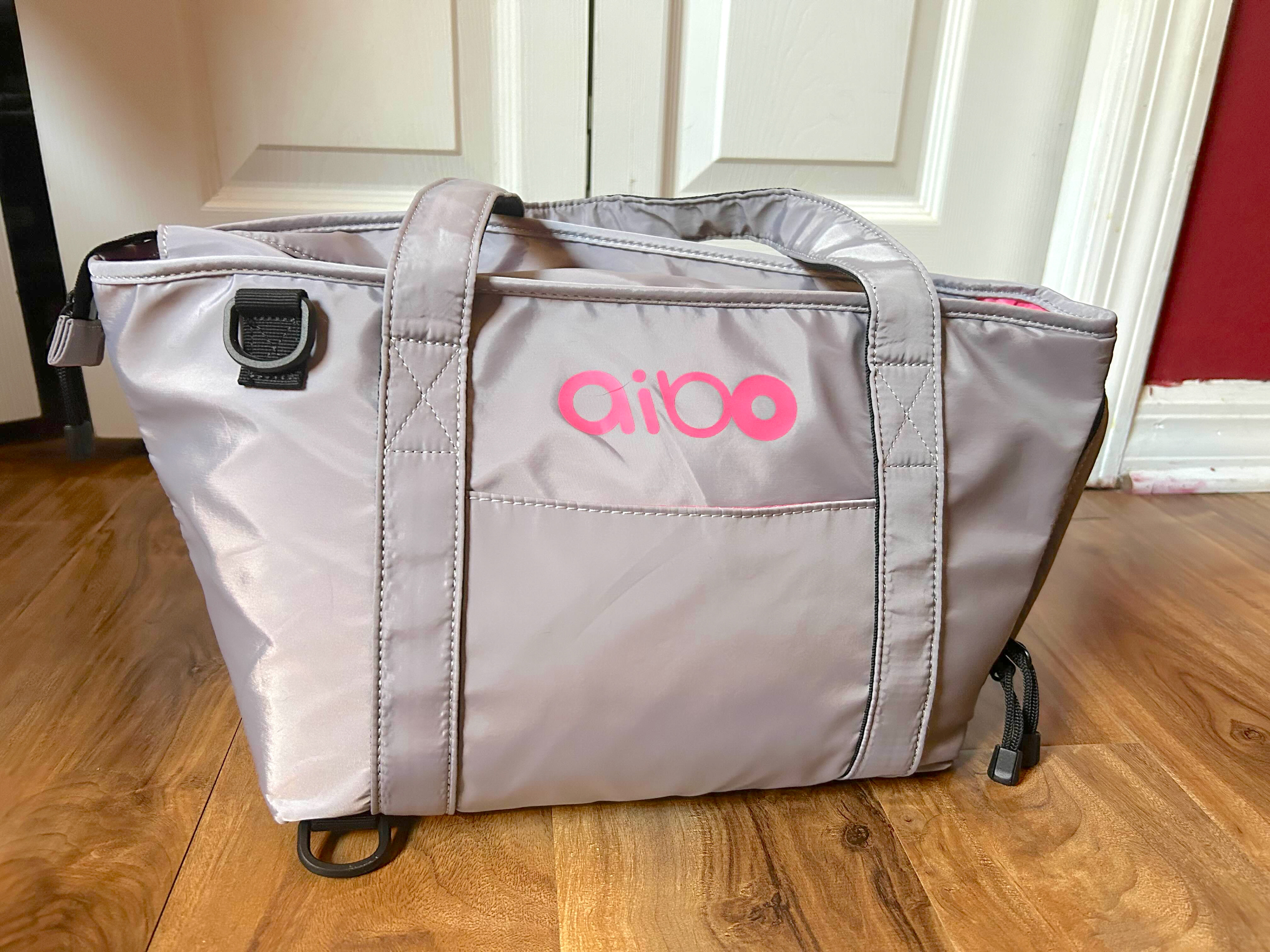 Created in response to owners requesting a newly designed aibo carrying bag with a slimmer profile to make it easier to travel with. The bag features handles, a shoulder strap and an optional clip on strap that allows the bag to be carried on ones back. There is a zip up flap at the front of the bag which when unzipped reveals the aibos face behind a mesh covering.