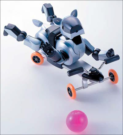Aibo Speedboarder for ERS-210/220 is the software distributed alongside the Aibo Speedboard accessory made for ERS-1xx and 2xx series aibos. The software functionality is quite limited in that its main objectives is to perform basic movements (pushing itself along with its back legs and manipulating the handle bars) while mounted to the speed board and track the ball.
