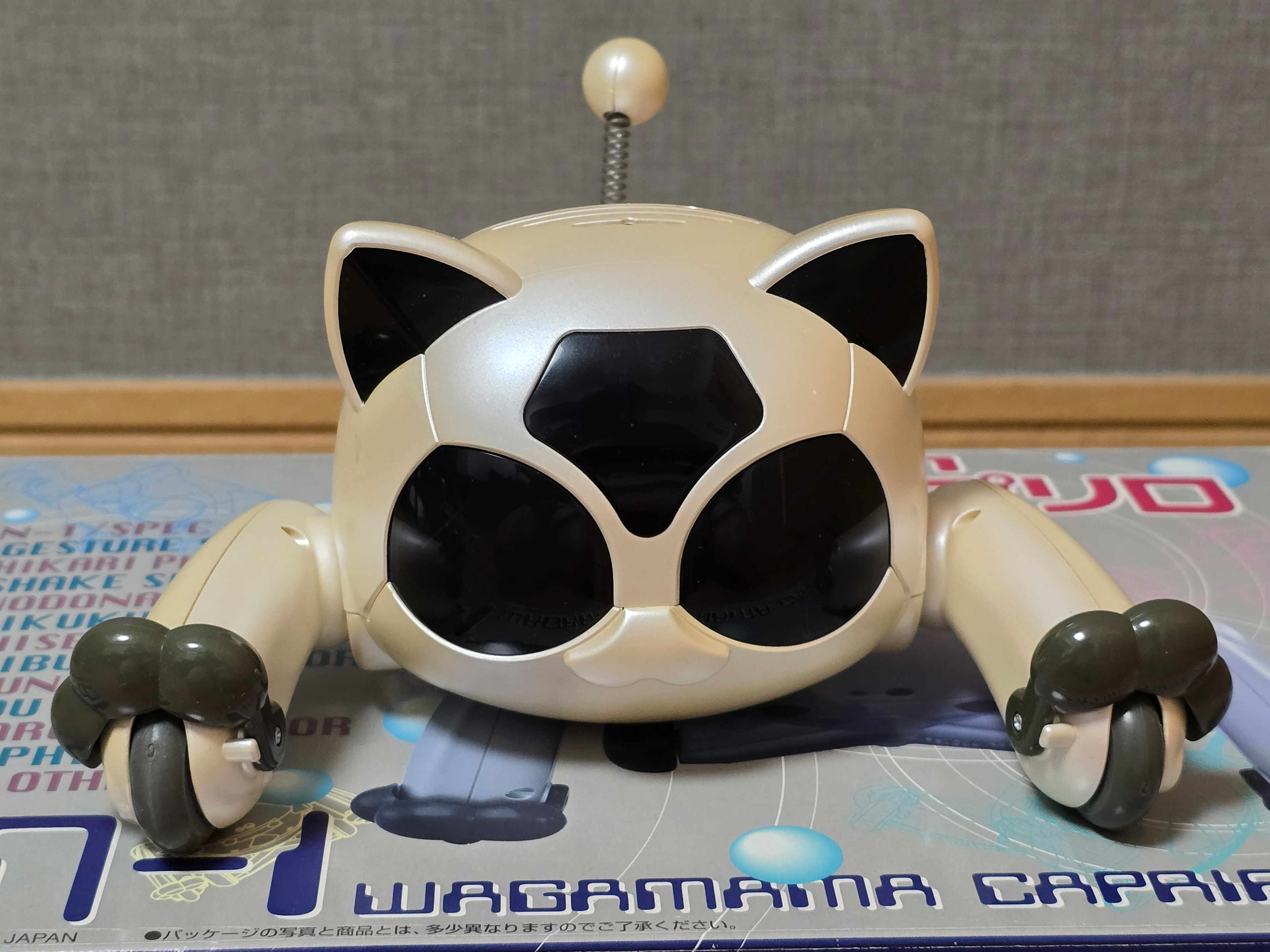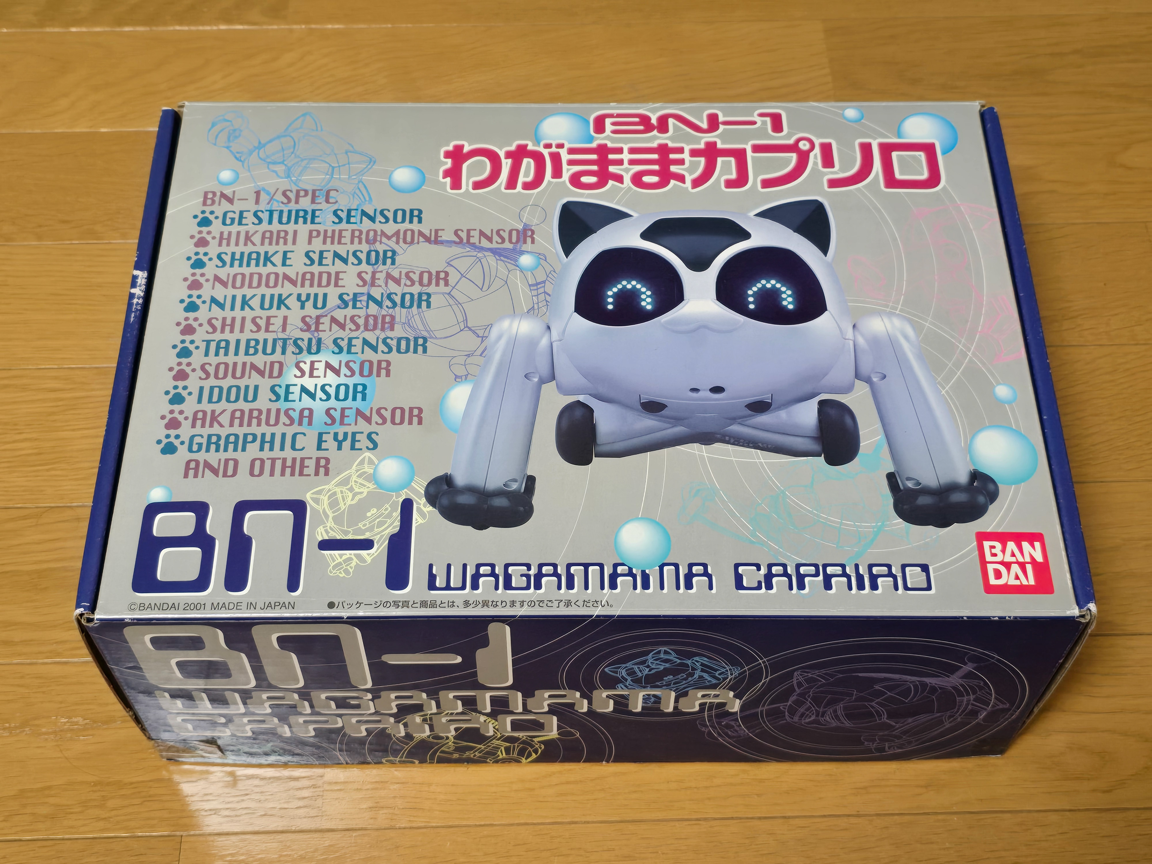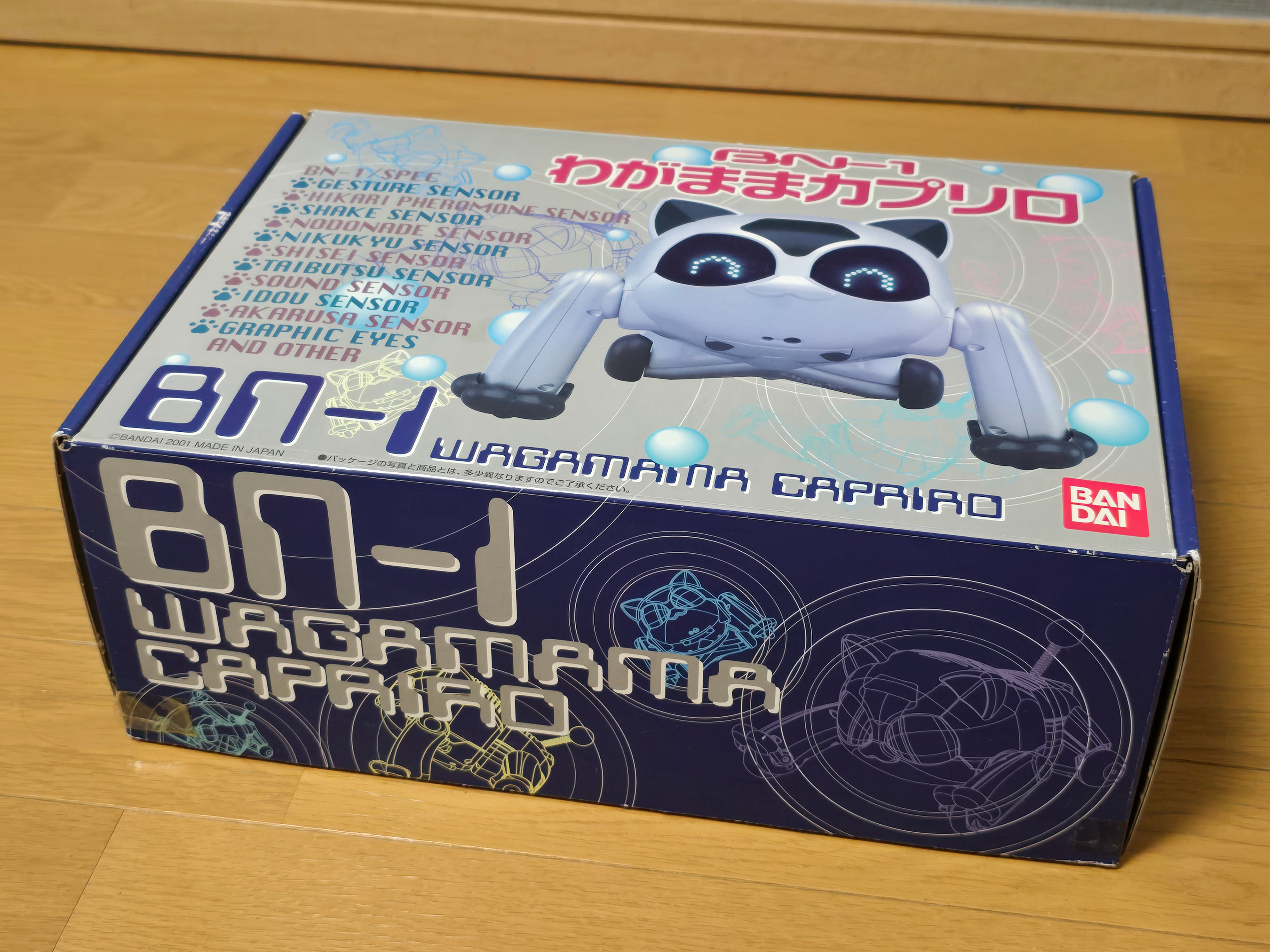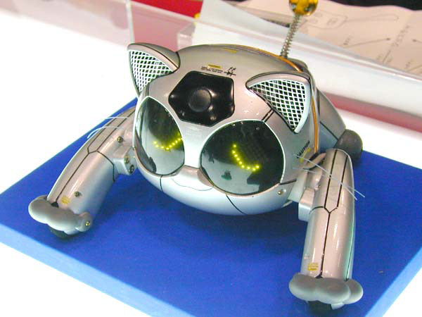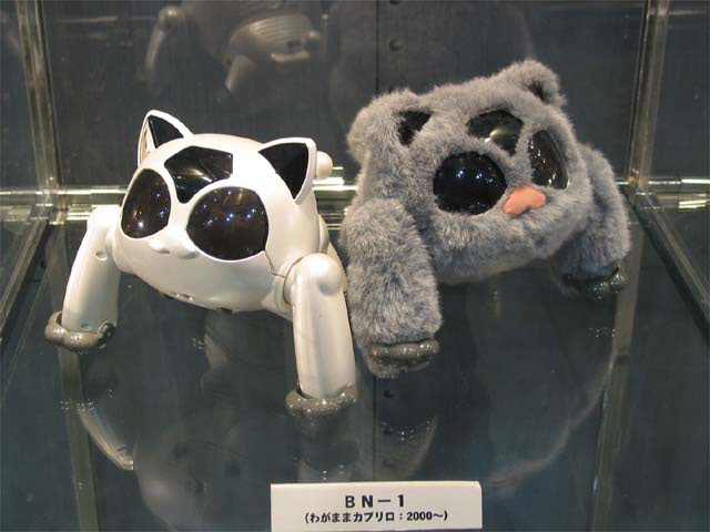 The BN-1 'Wagamama Capriro' is a companion/entertainment robot by Bandai released in 2001 to serve as an alternative to the Sony Aibo. It features a whole host of functionality and sensors - some being very unique to the robot such as being able to wirelessly programme it over IR. The cat moves around using wheels on its front and back legs, letting it move with considerable speed compared to other robots at the time. It was also able to roll over thanks to the swivel joint in its rear half.