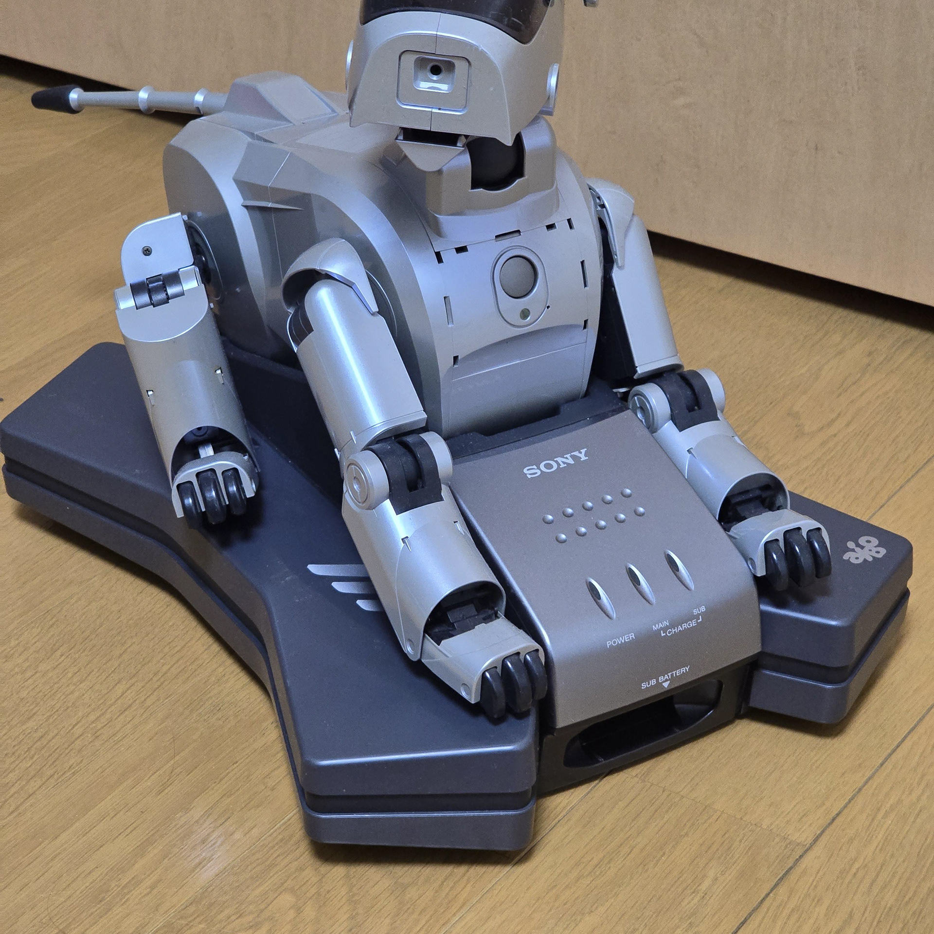 これは、ERS-110、ERS-111、ERS-1100の各aiboに付属する充電ドックです。ドック自体は、その構造上、かなり大きく重いです。aiboをドックに置いて充電できるだけでなく、本体前面には付属のセカンドバッテリーを充電するためのセカンドバッテリースロットも備えています。