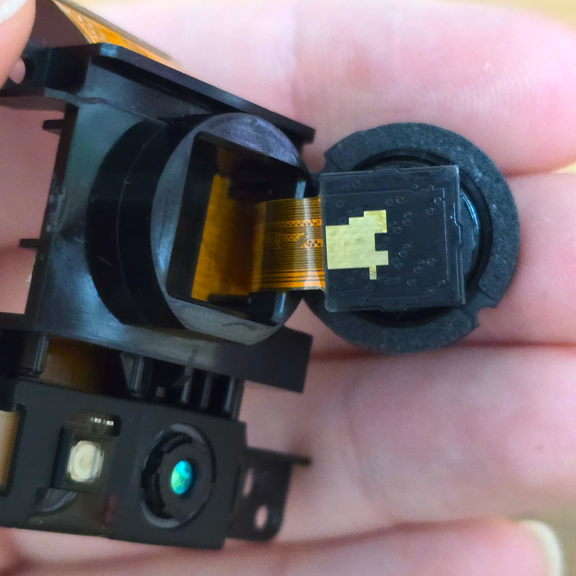 カメラモジュールはプラスチック製のマウントに取り付けられており、このマウントにはToFセンサーも内蔵されています。ToFセンサーは通常、aiboの黒い口の窓の後ろに隠れています。取り外すには、モジュールを背面の基板から取り外し、フレキシブルケーブルコネクタを側面の穴に差し込み、カメラをゆっくりと前方に引いて穴から取り外します。