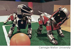 左:両チームのERS-1100がボールの奪い合いを繰り広げている。MUTANTと同じく、ERS-1100はCMで使用されているピンク色のボールではなく、オレンジ色のボールを使用している。これは、一部のaiboで使用されている赤いボディマークとの混同を避けるためだろう。