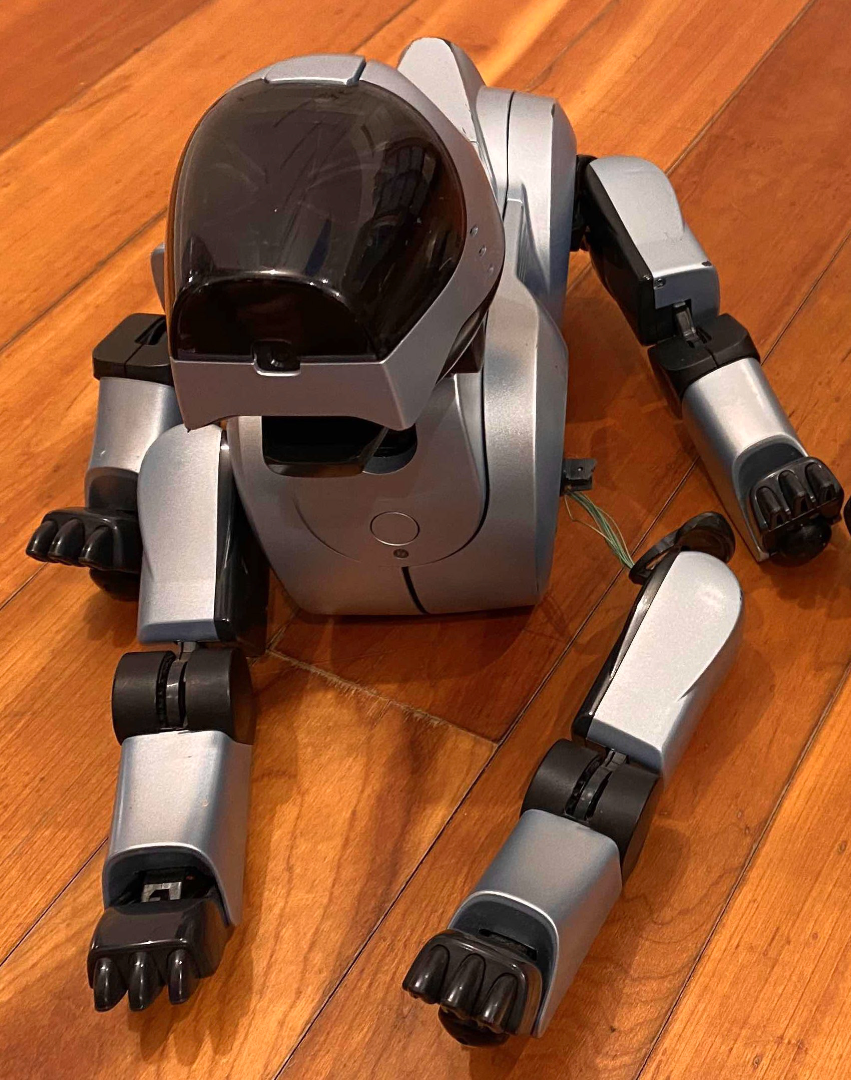 This is Buster - He is an unknown stage ERS-210 prototype, though assumed to be an earlier DVT model. He has no butt nubs, no chin sensor nub, no frosting on his eyes, a short tail, shiny (instead of matte) black plastics, fewer screws in his core, unpainted silver hip joints, green leg wiring, large gaps in between leg blocks, and a different memory stick slot design. His core and each limb block is numbered. He does not boot without a memory stick and does not boot any software that has been documented in the community so far.