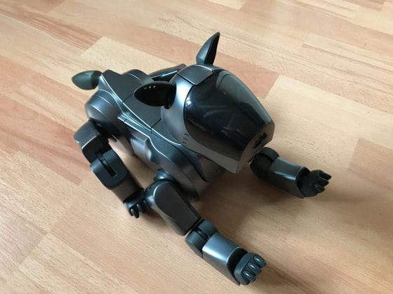 このaiboは市販のERS-210とほぼ同じように見えますが、後ろ脚モジュールの下にあるバット突起が欠落しており、販売時のステッカーもすべて剥がれています。唯一残っているのは、バッテリーケースに貼られた「0000041」と書かれたシリアル番号ステッカーだけです。