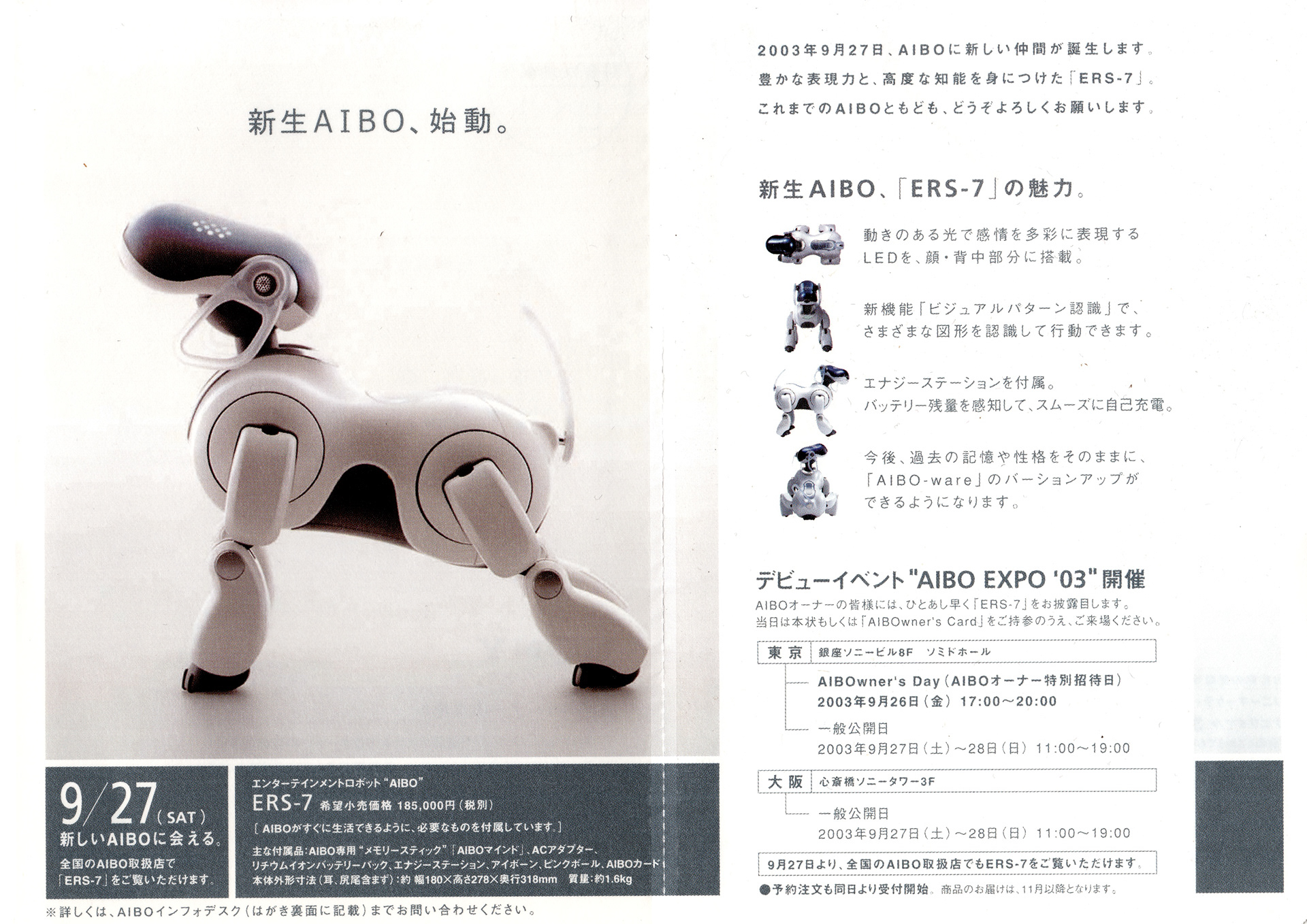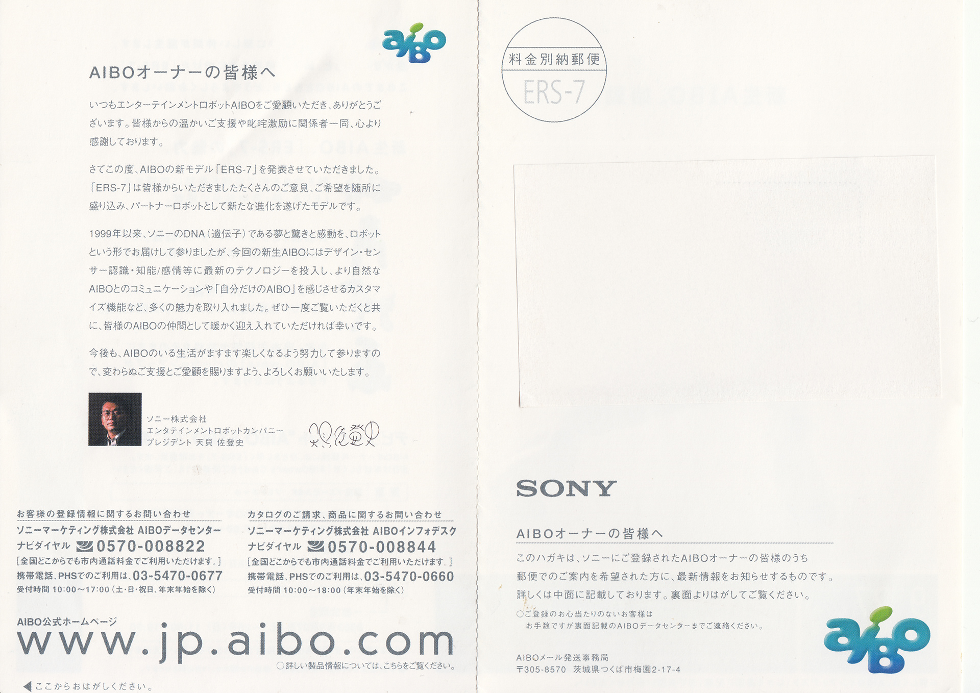 Invite letter sent to current aibo owners announcing the birth of the ERS-7 as well as inviting people to attend the ERS-7 launch event at Sony Building in Ginza.