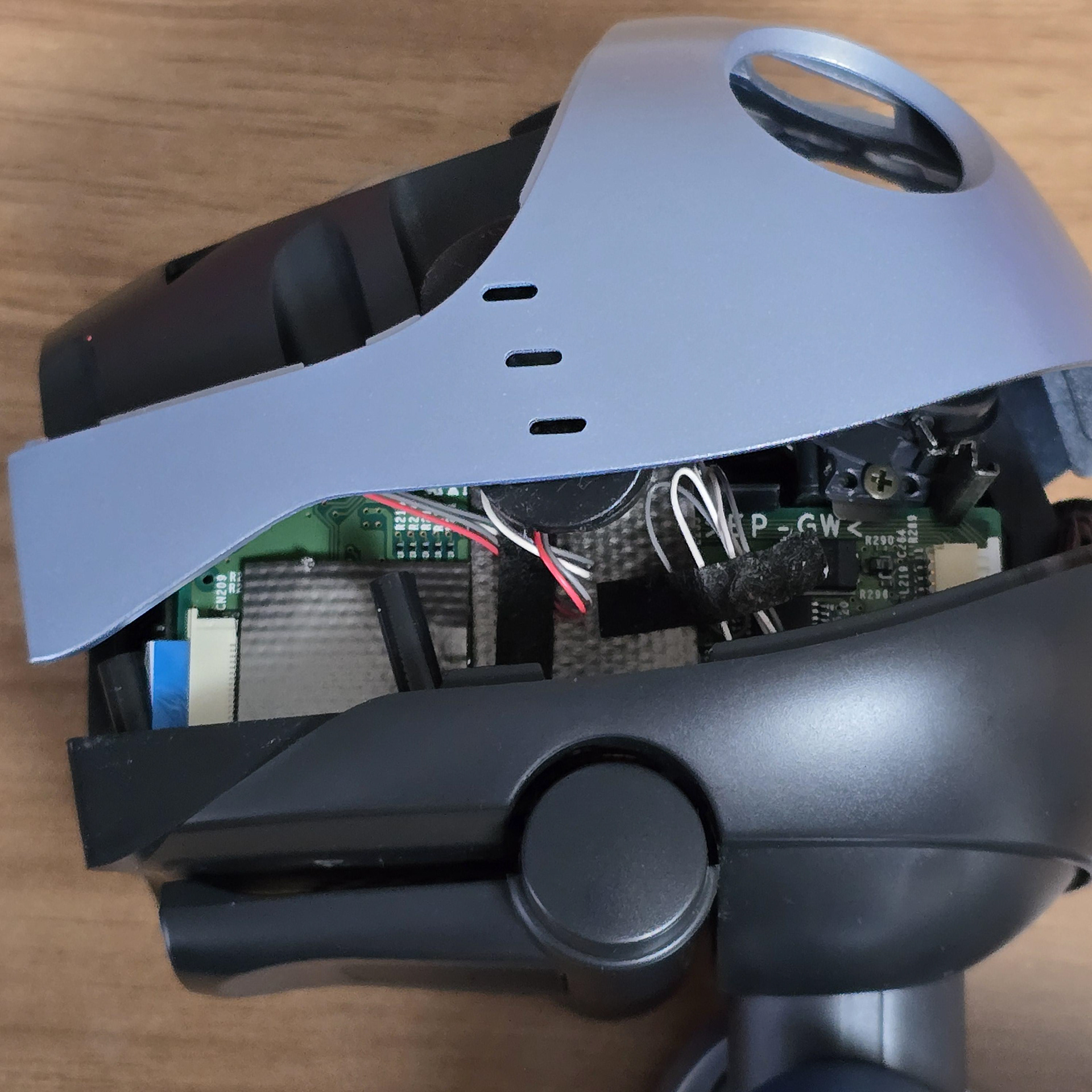 埼玉のハードオフで安物のジャンク品ERS-210を救出したところ、起動時に頭が左側に最大角度まで傾くと、傾斜軸症候群の症状が現れることがわかりました。頭が動かなくなり、手で解放するまで大きな音を立てていました。aiboが起動シーケンスを通過すると、症状は現れなくなりました…これは非常に奇妙に感じ、頭をよく聞いてみると、配線がプラスチックに擦れる音が聞こえました。これに基づいて、確認したい仮説が浮かび、頭を開けてみました…