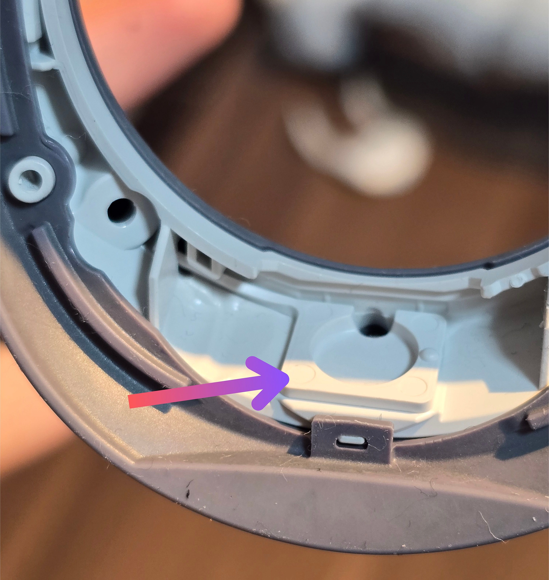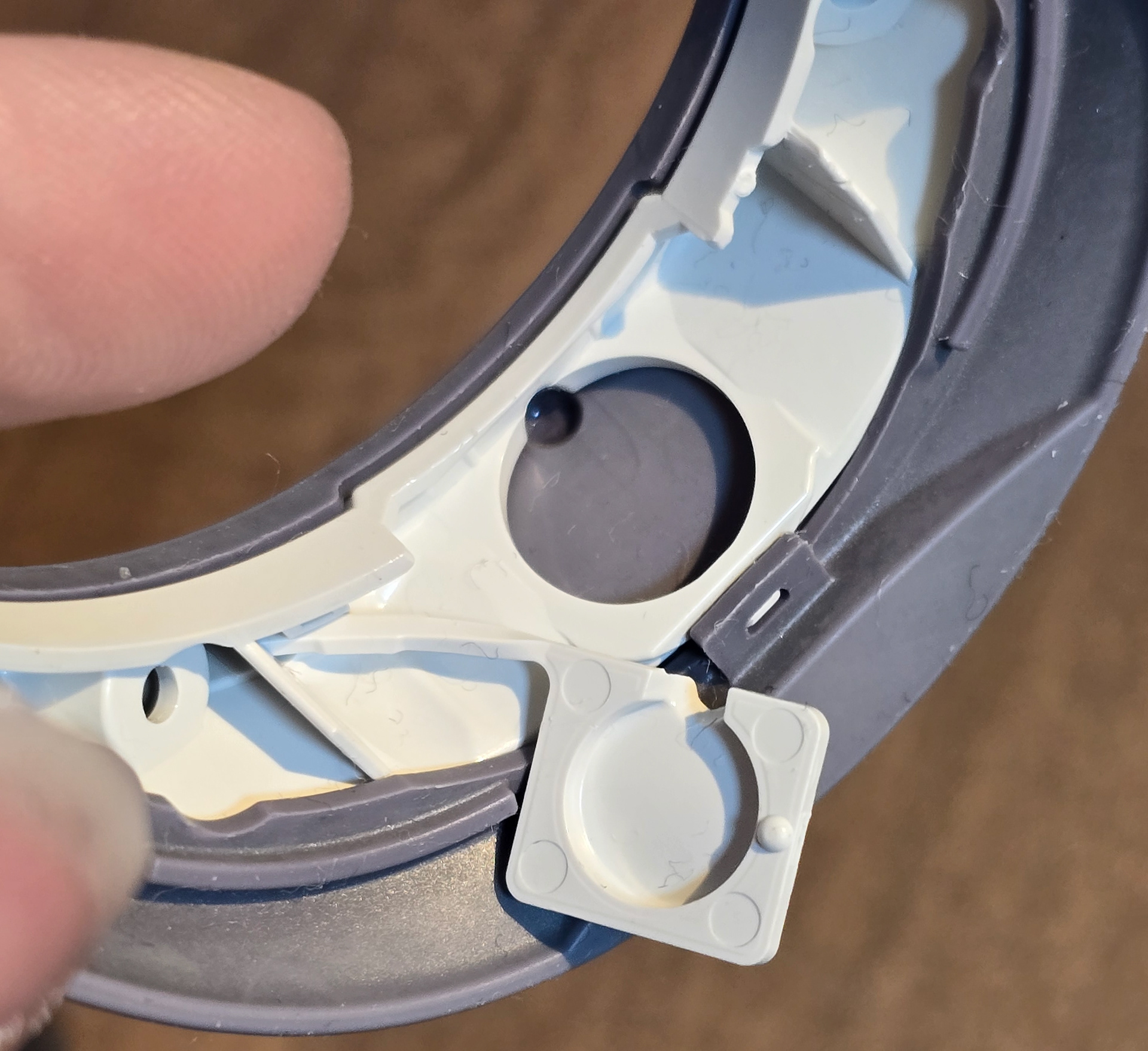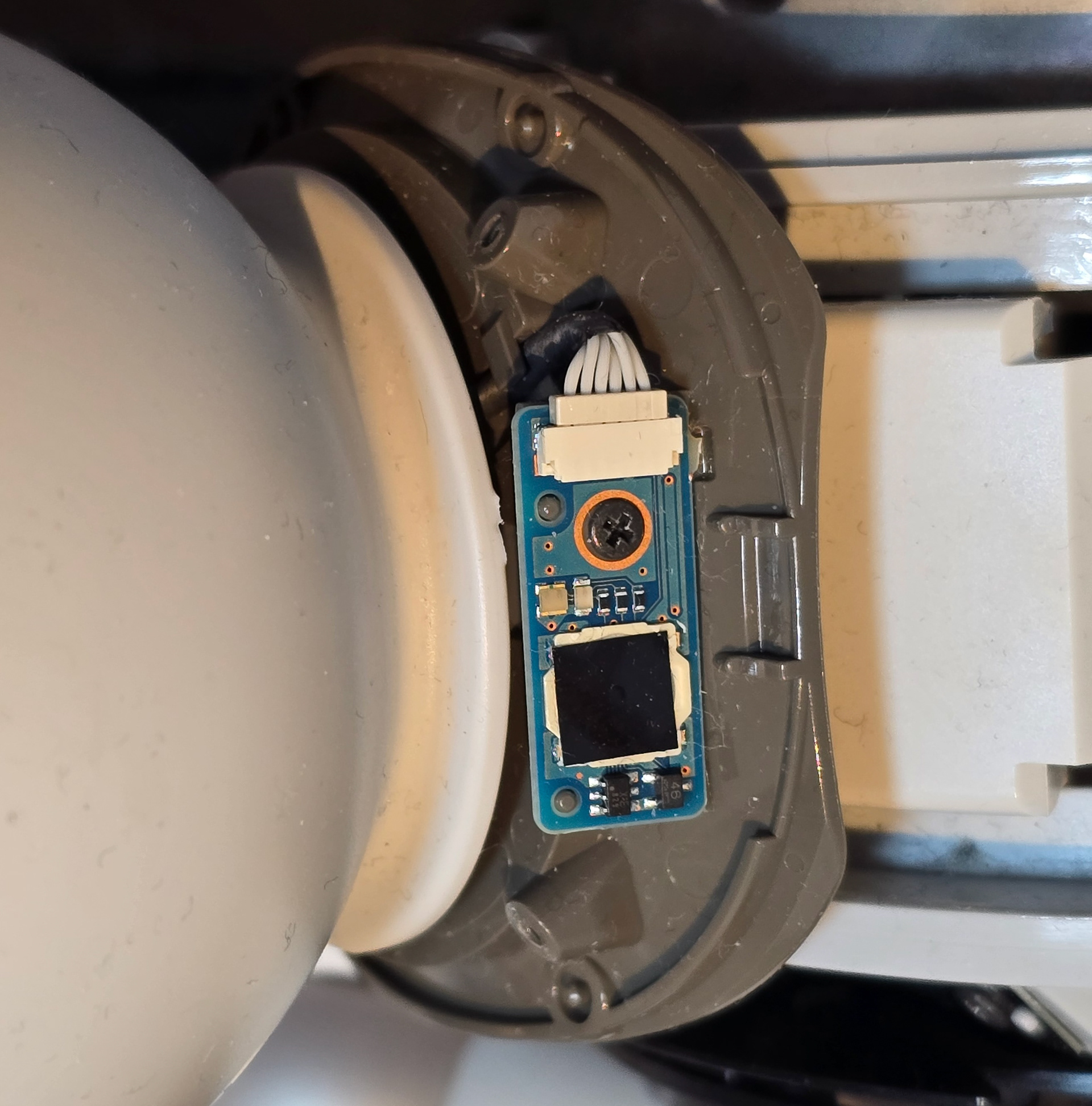 電源ボタンは、プラスチック製の首輪リングマウントとゴム製の首輪カバーの下にある灰色のプラスチック製の首輪部分にねじ止めされたシンプルな基板です。ボタンは背面の四角いステッカーの下にあり、首輪ボタンを押すとプラスチック製の部品によって押し込まれます。