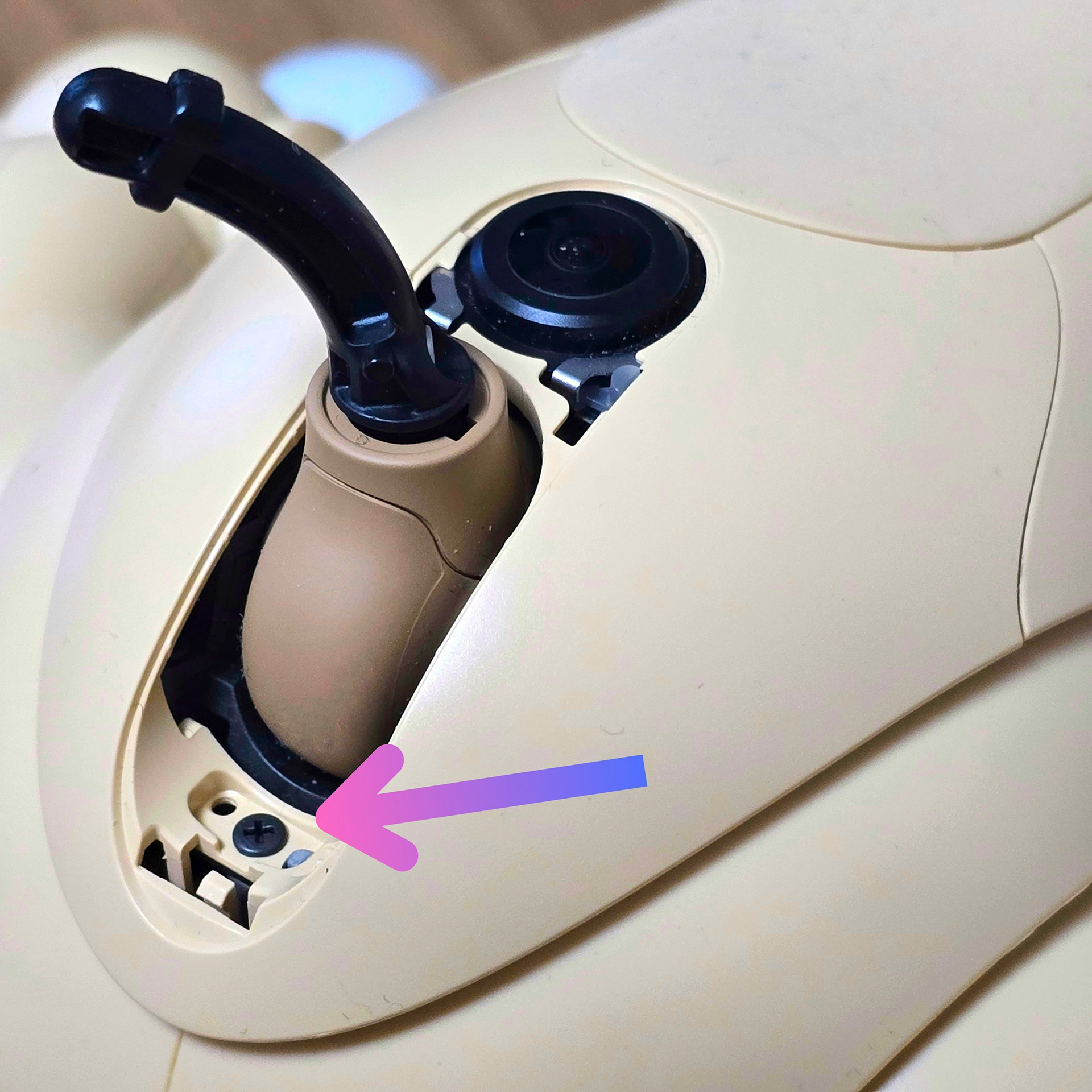 Then, slightly lift up the butt lid and use your fingernail or a thin object to push the tab into the space while lowering the butt lid back down. That should solve the squeaking issue. Now replace the screw, tail ornament and tail.