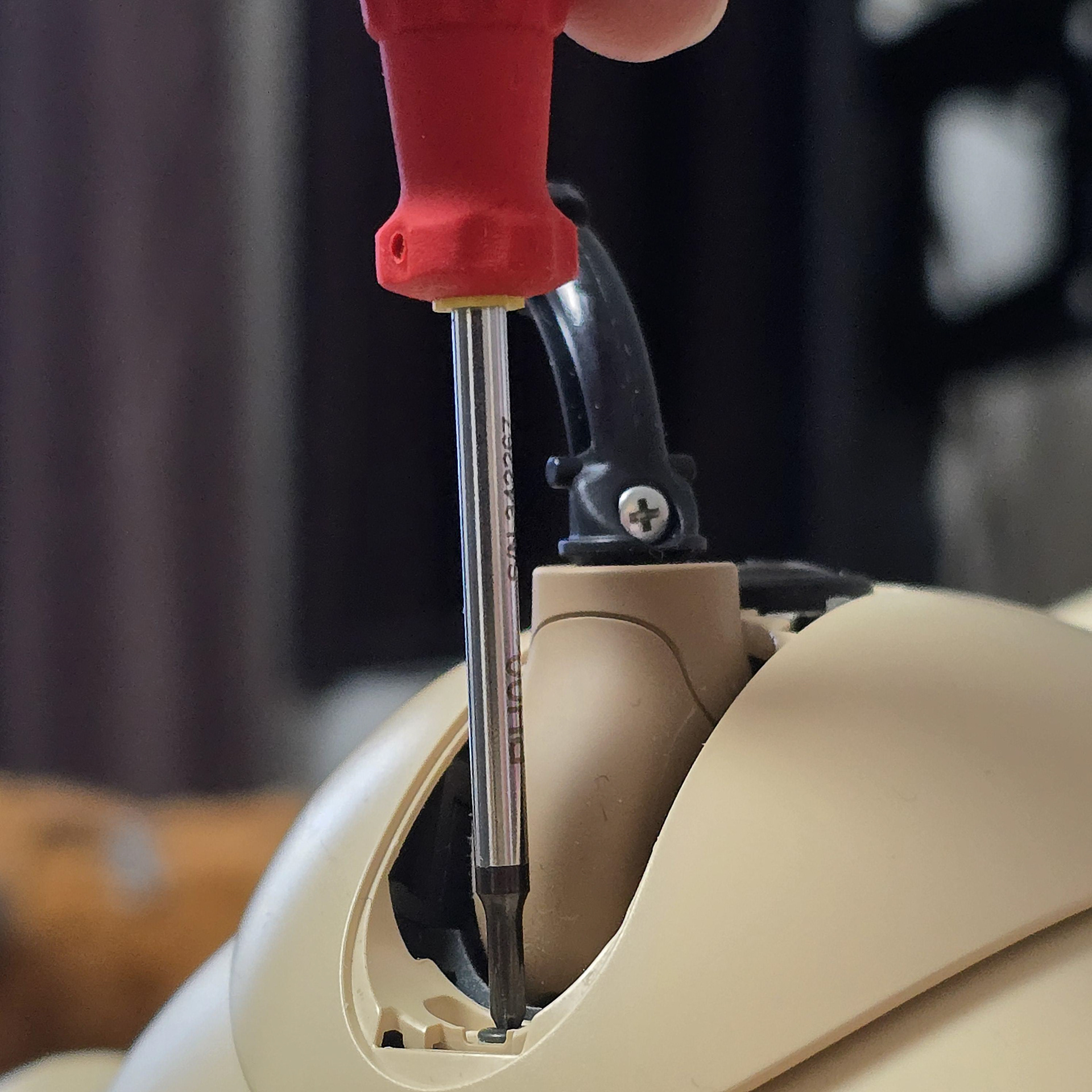 Once the tail ornament is removed, a screw will be visible. Take it out using a 00 JIS screwdriver.