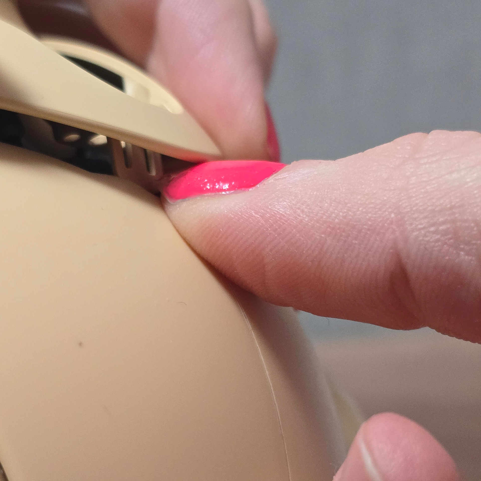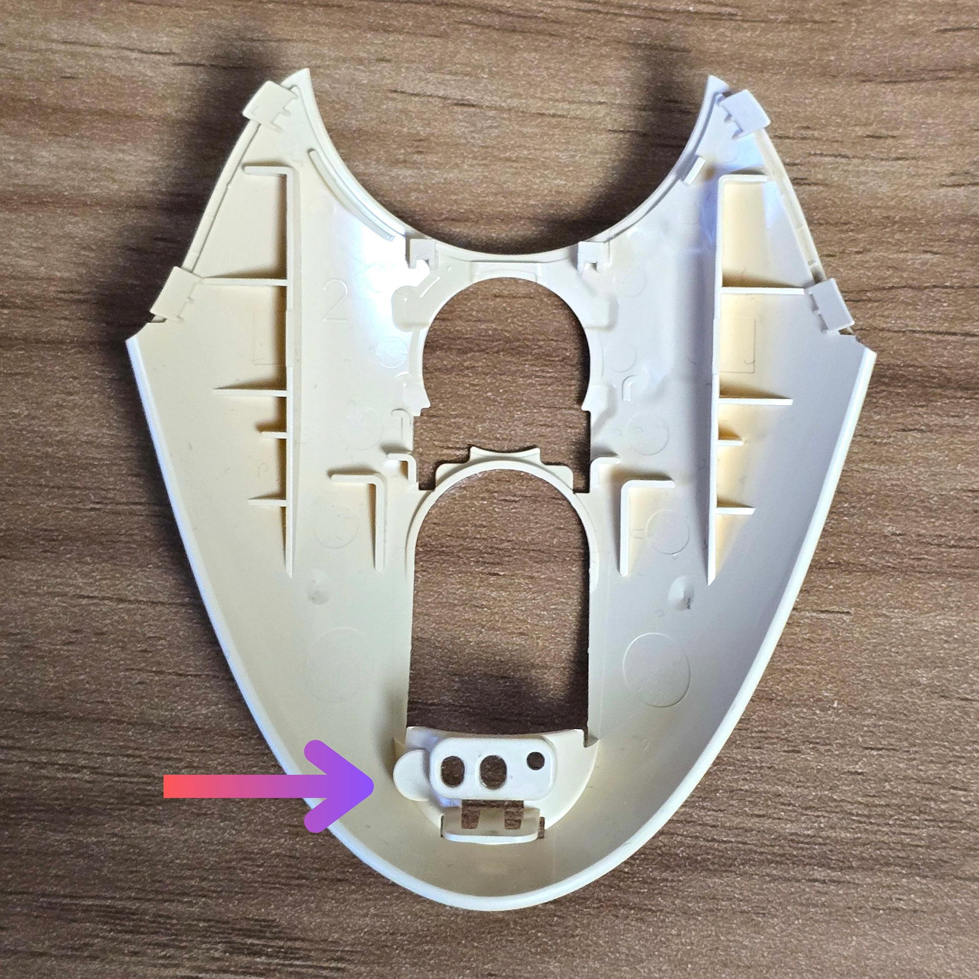 次に、バットリッドを少し持ち上げ、爪か細いものでタブをスペースに押し込みながらバットリッドを下ろします。これでキーキー音の問題は解消されるはずです。ネジ、テールオーナメント、テールを交換してください。