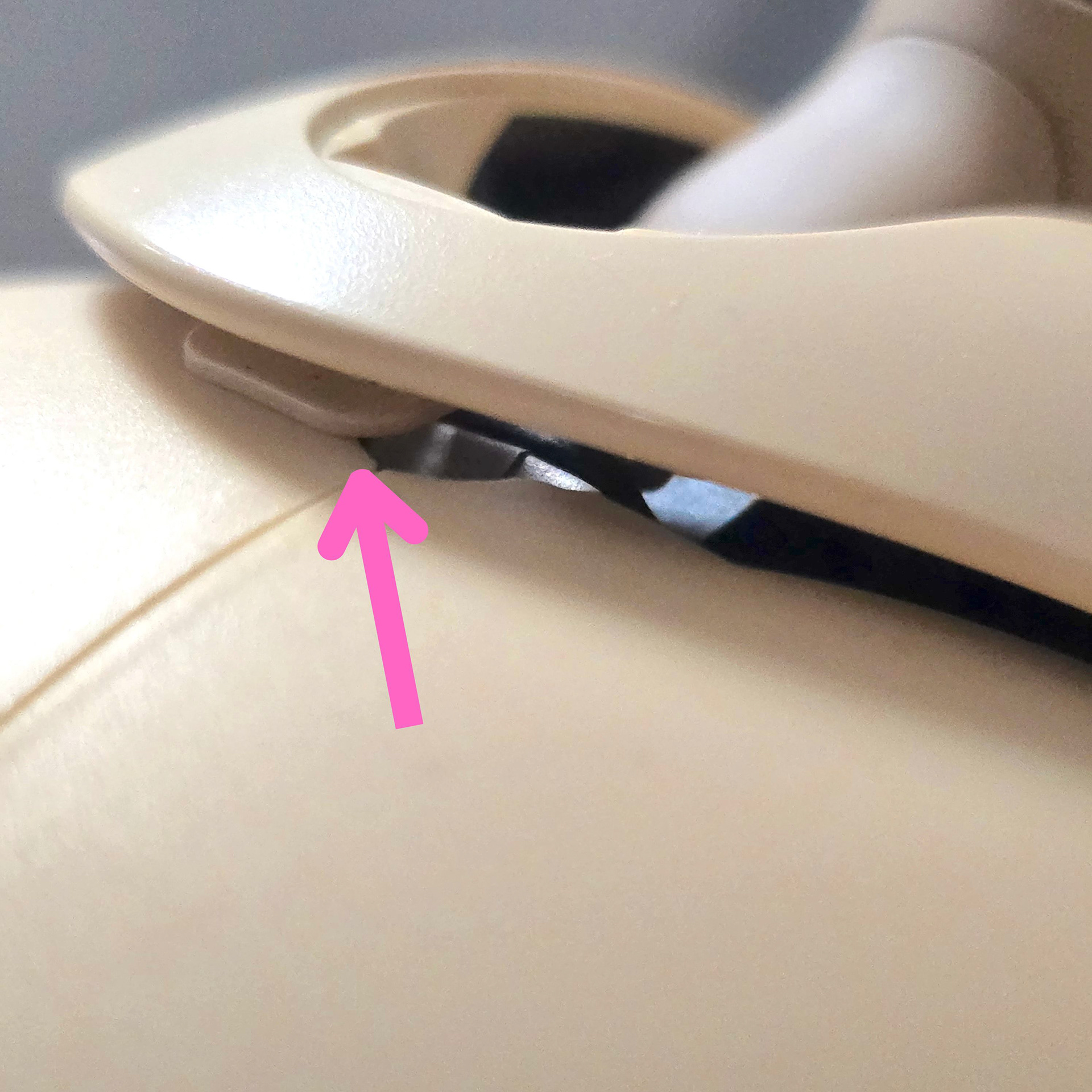 再組み立ての際には、このタブを前方に押して、ピンク色の四角形の内側のスペースに下がるようにする必要があります。