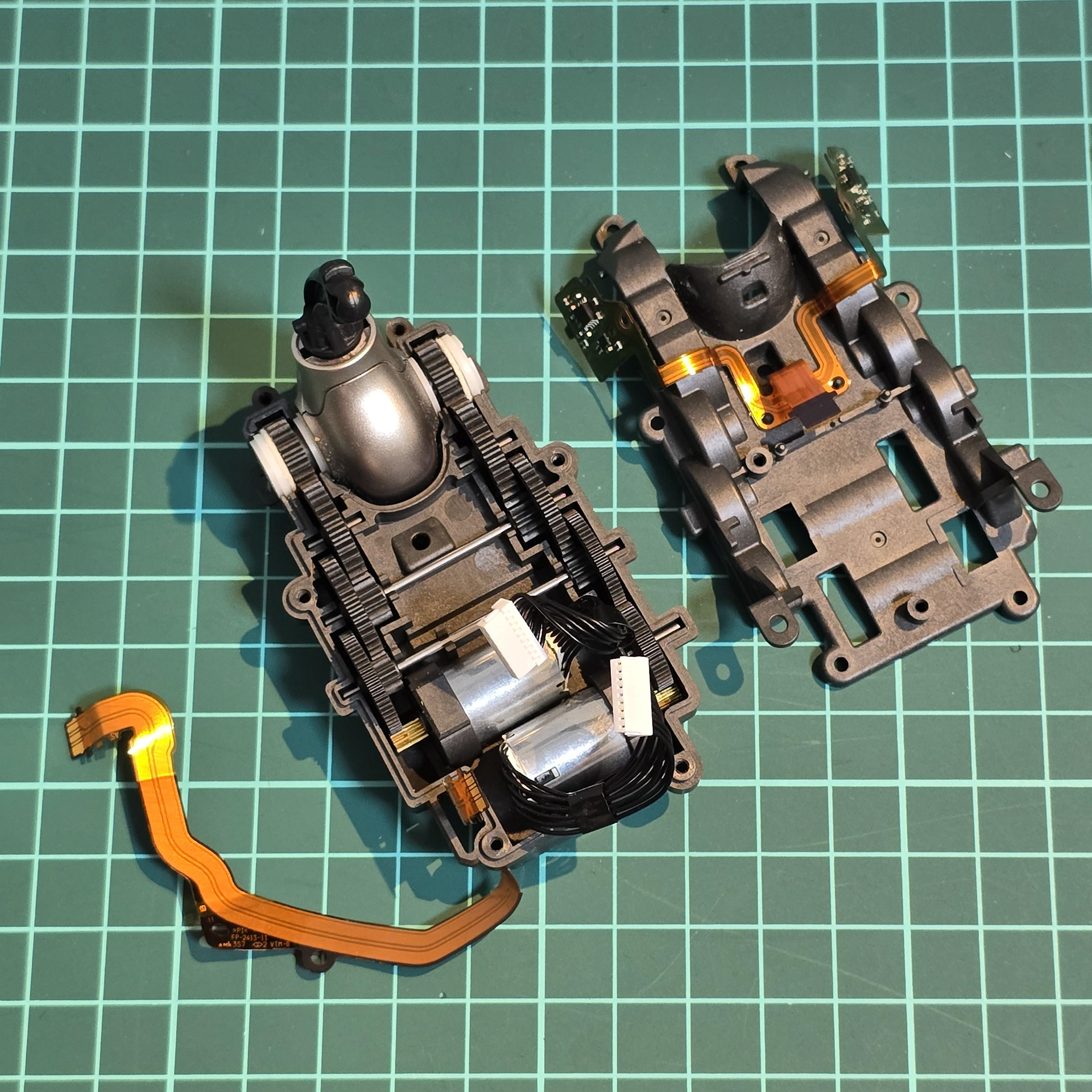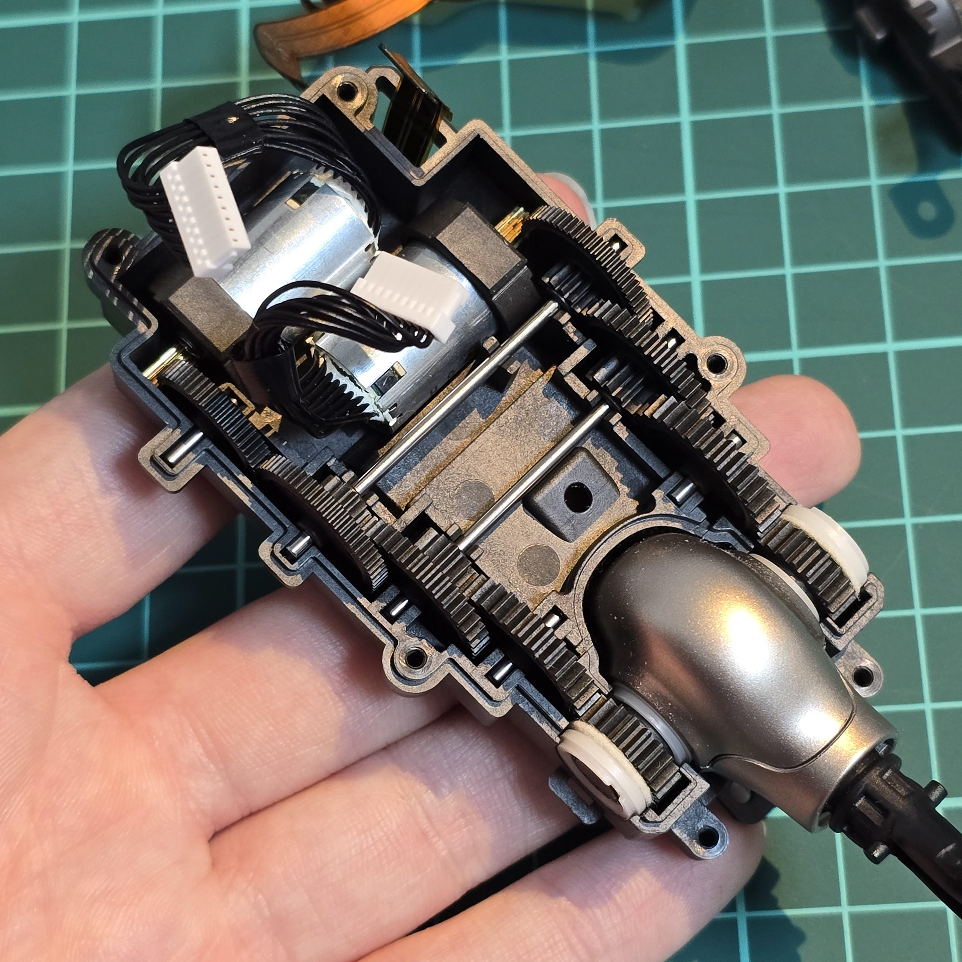 すべてのネジとトップボードを取り外したら、黒いワイヤーを上部のプラスチック蓋の穴に通して、テールモジュールケースの左右の半分を完全に分離します。これでサーボとギアボックスにアクセスできるようになります。