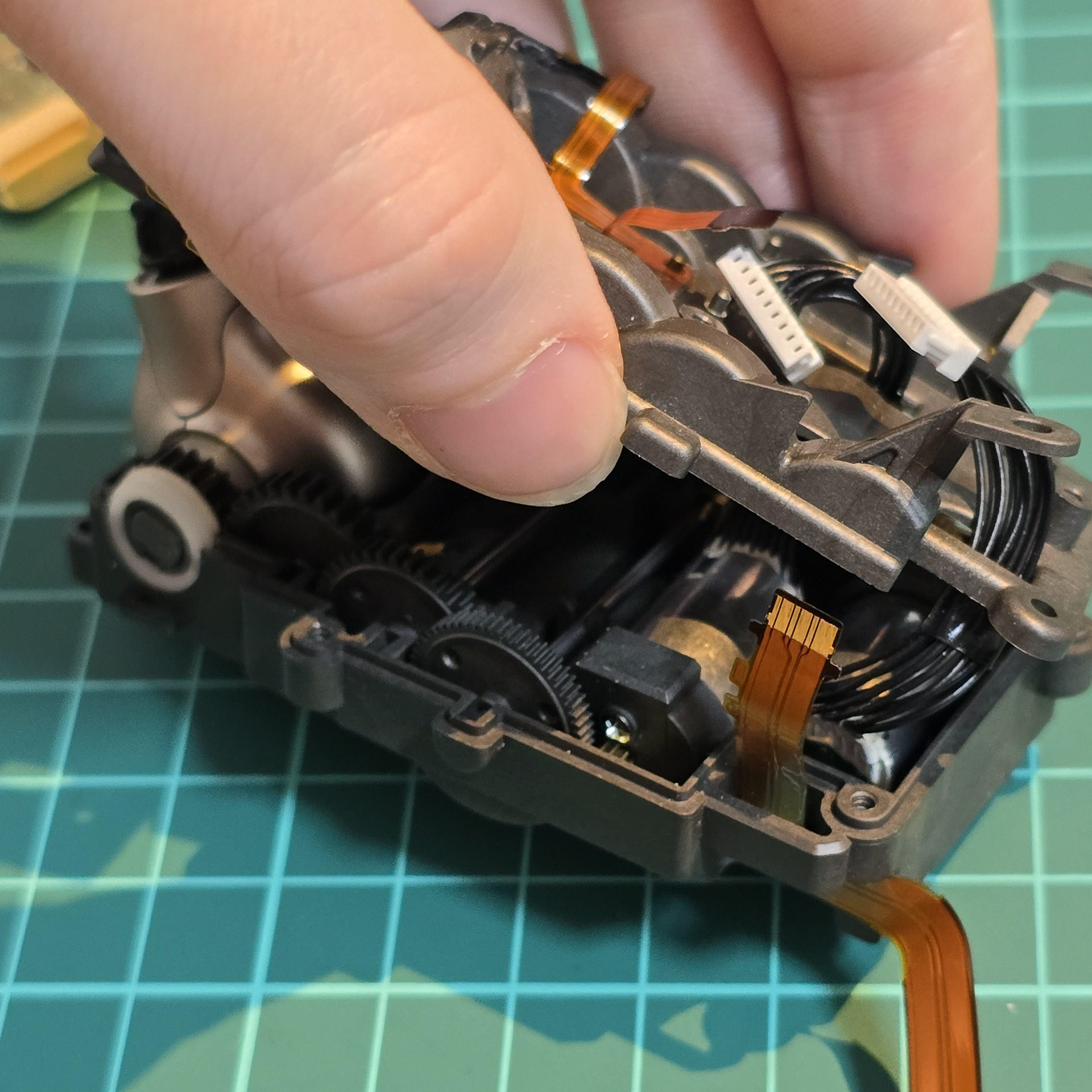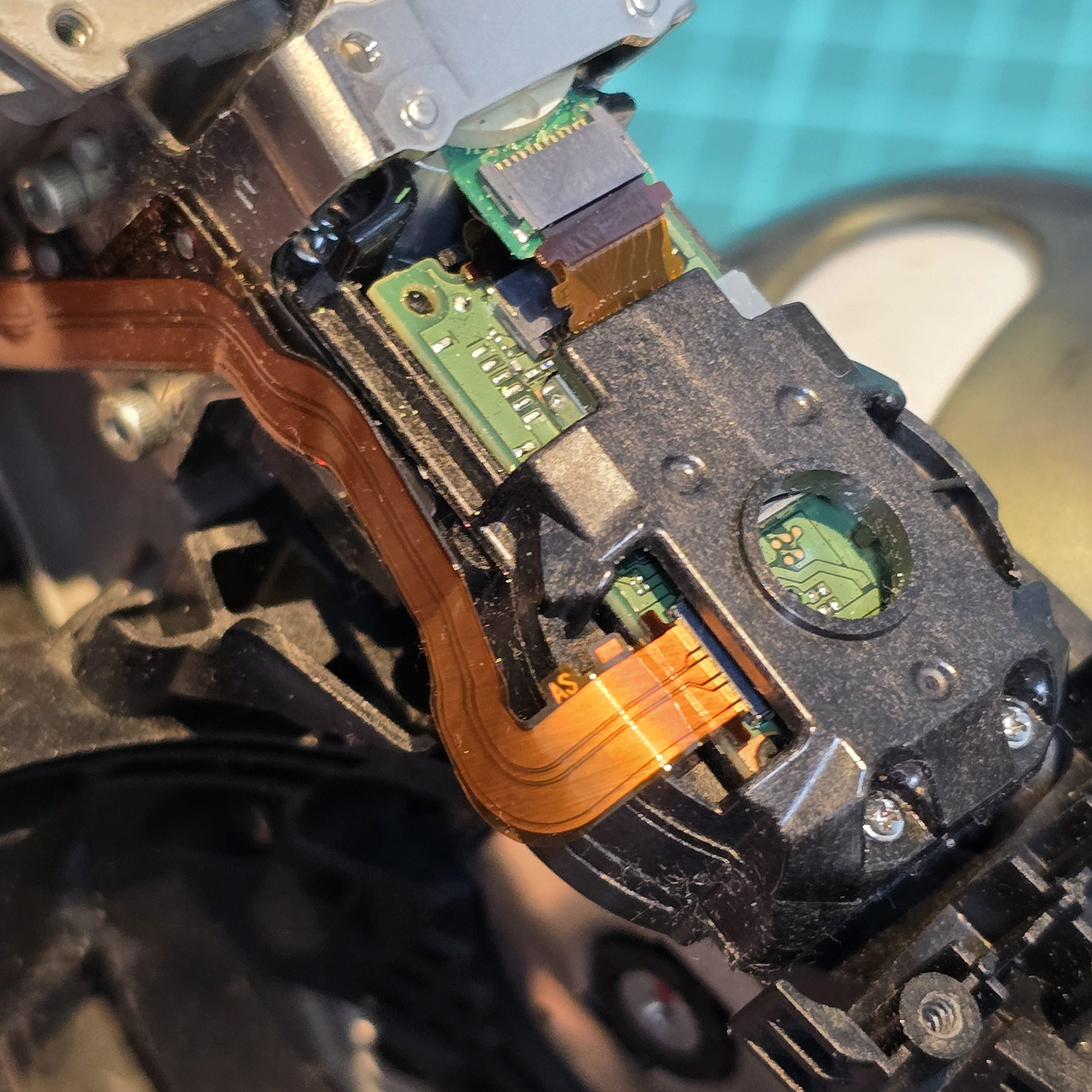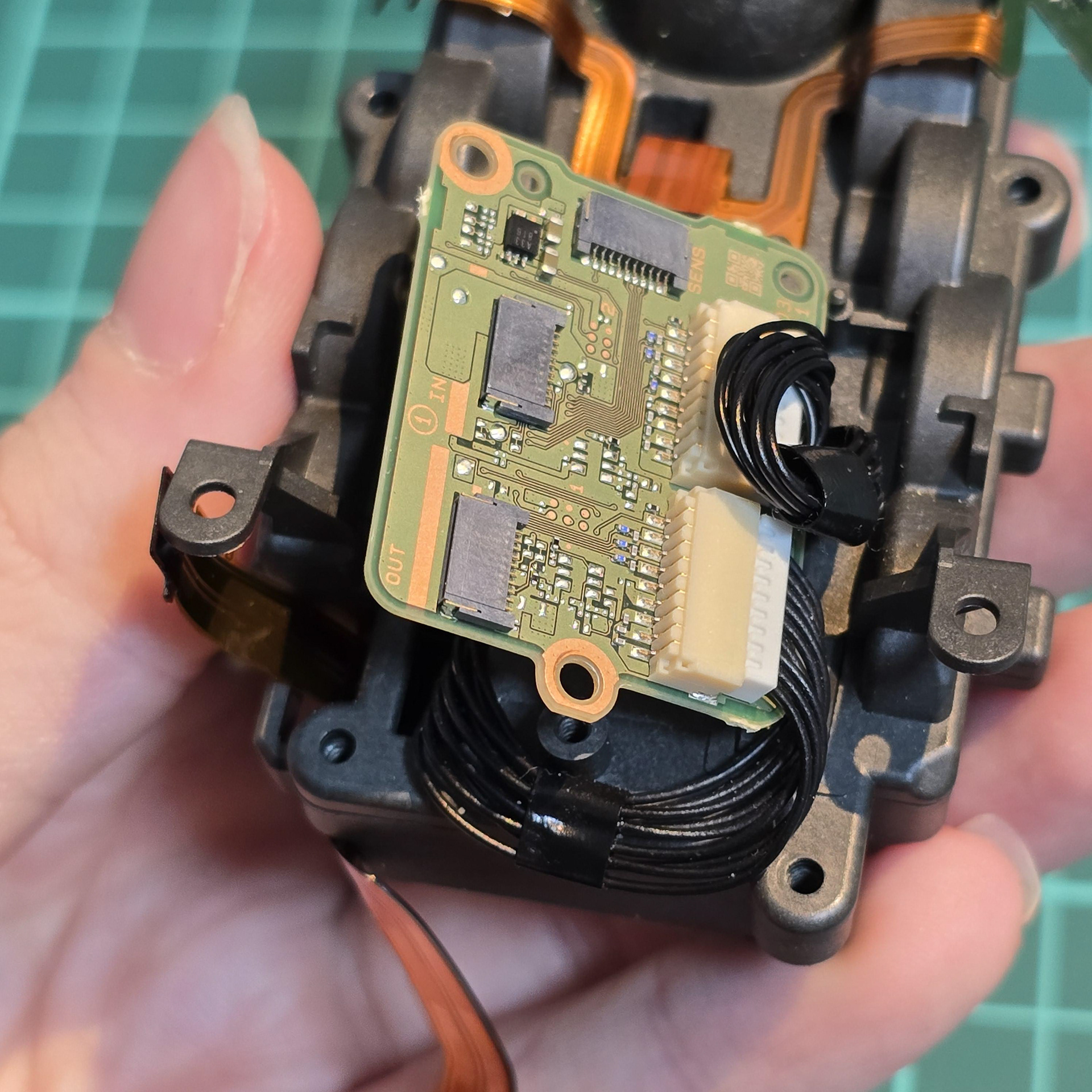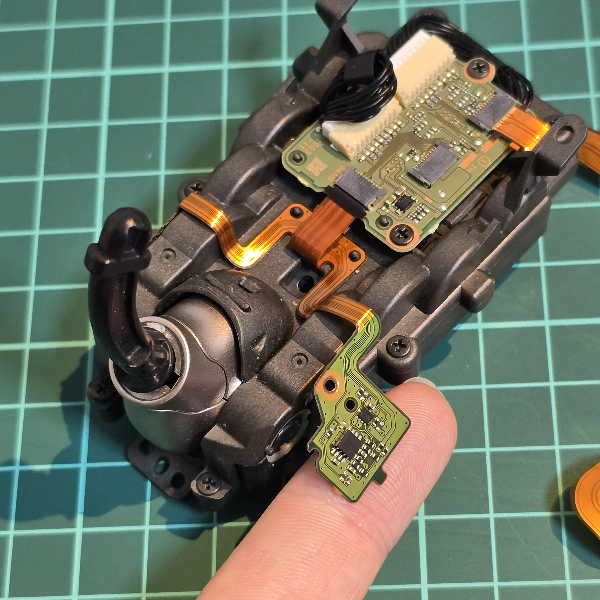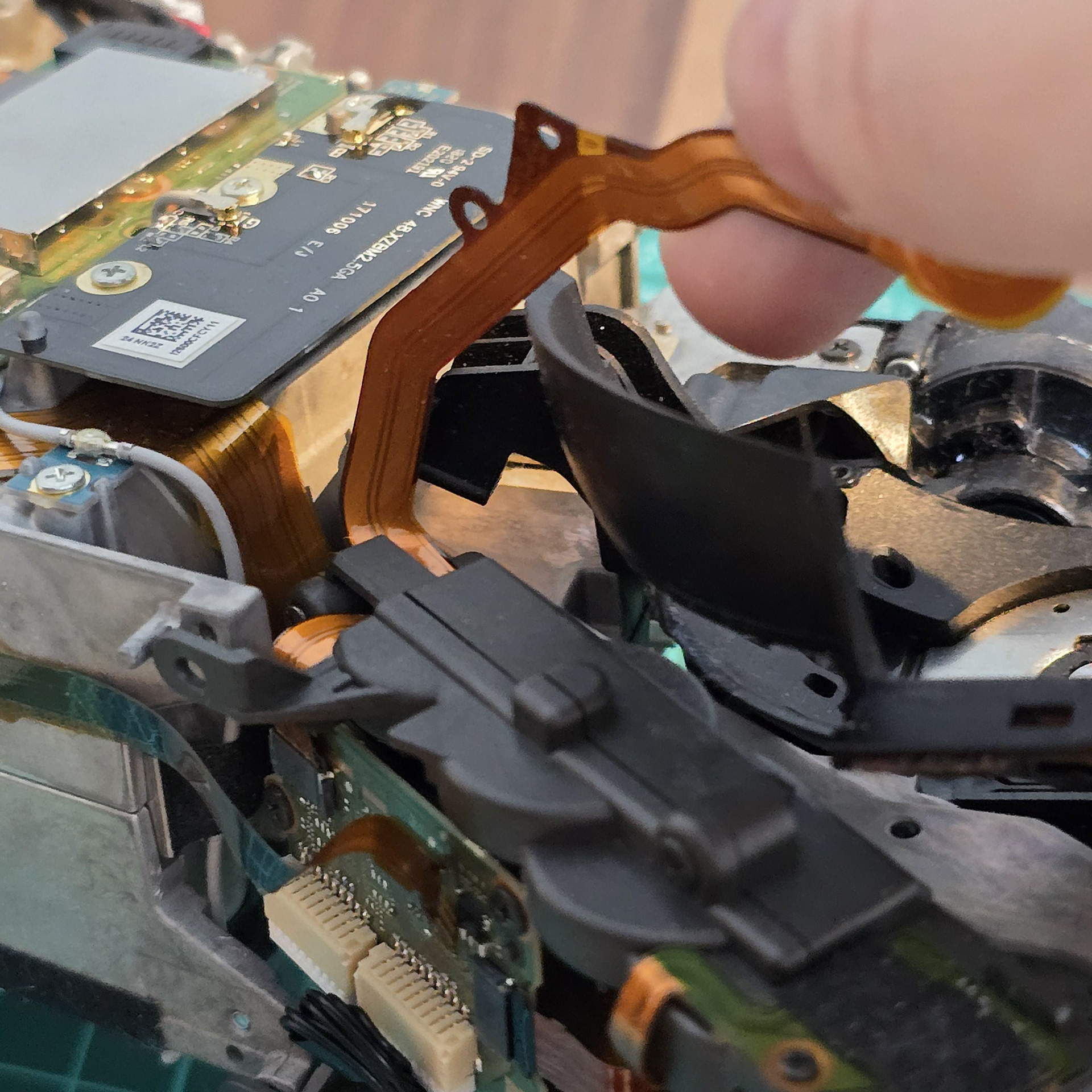 Once the adhesive has been peeled away from the flexible cable, the module is free to be lifted off of the aibo body.