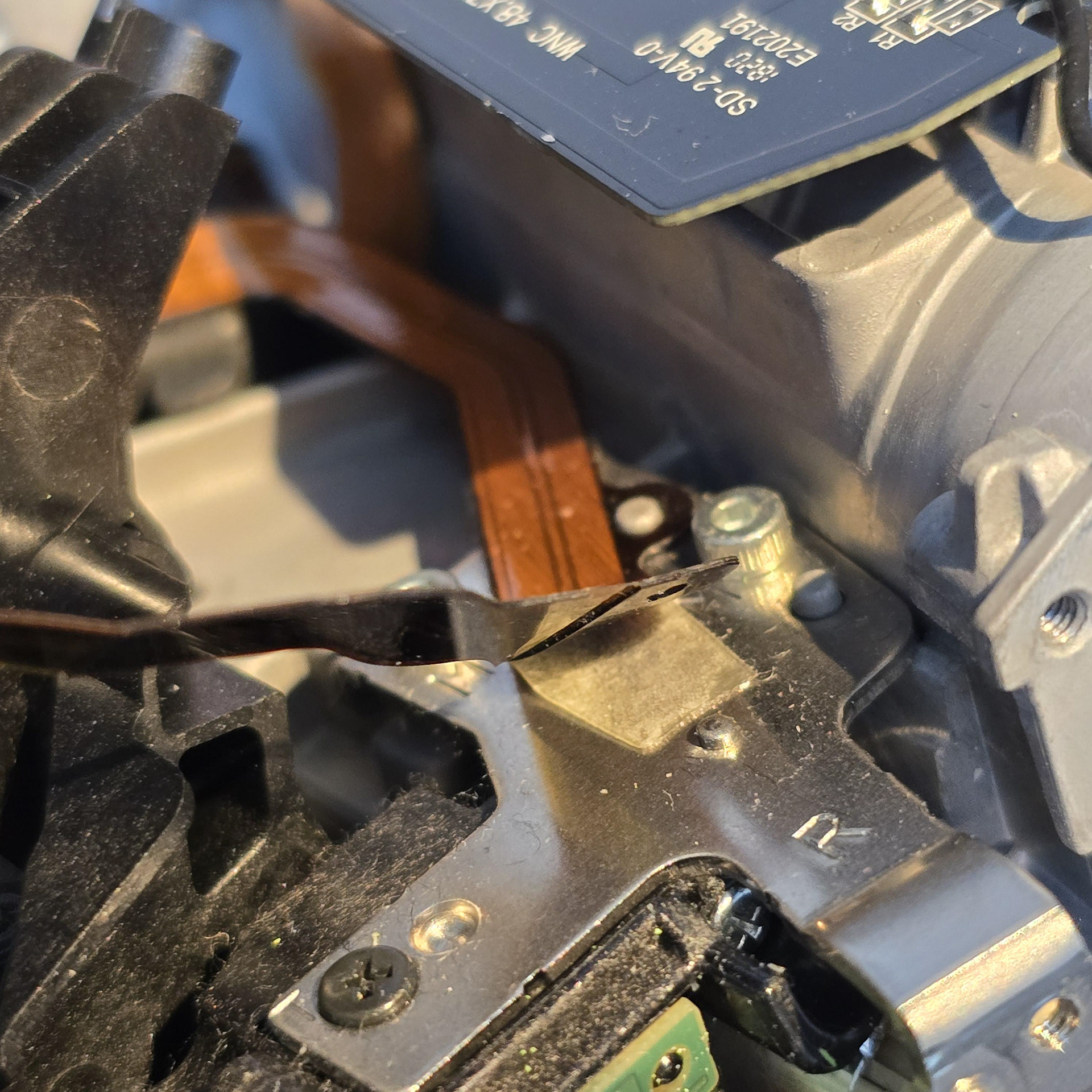 モジュール全体を固定している中央のネジを外し、テール モジュール ボード上のこのフレキシブル ケーブルを外します。