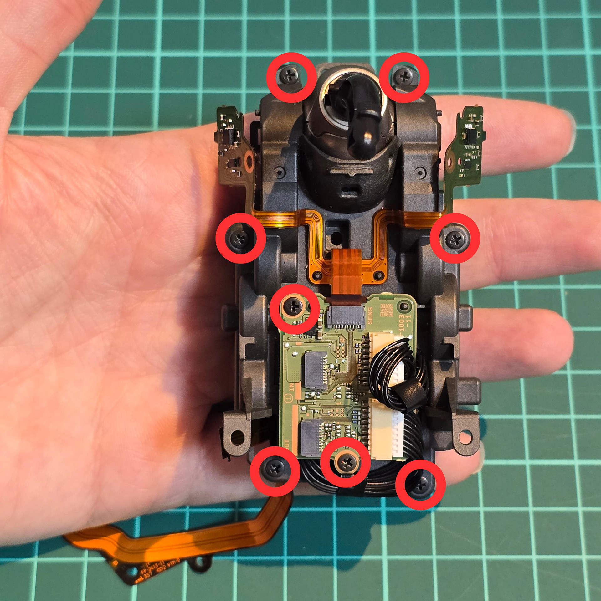 モジュール全体を開けるので、図で丸で囲んだネジをすべて外してください。これで上部の回路基板と、テールモジュールケースの2つのプラスチック製パーツが外れます。基板を持ち上げて、2本の黒いケーブルを外します。