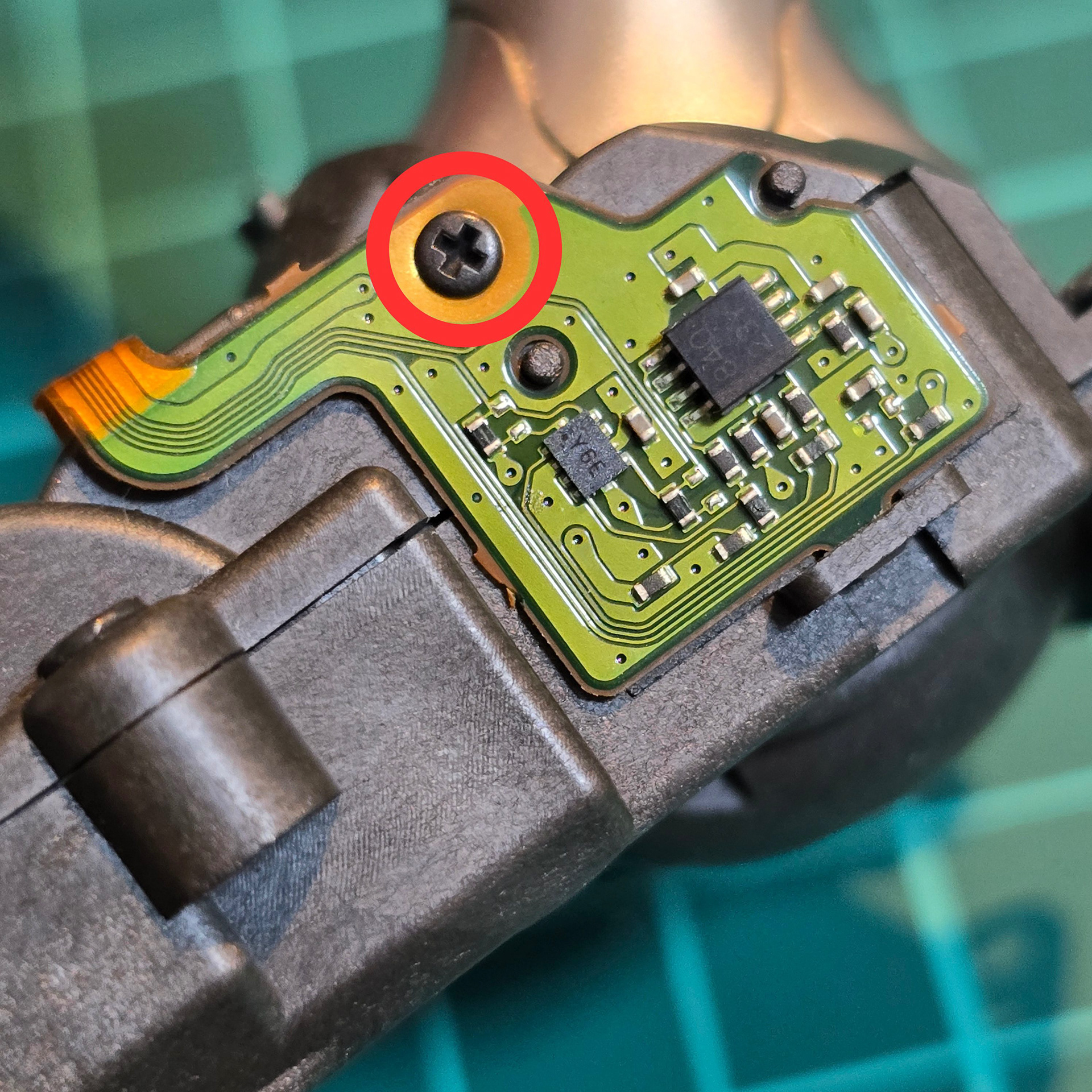 次に、テールモジュールを開けます。テールハブ付近のモジュール両側にある緑色のフレキシブル基板に注目してください。後期型のaiboではこの基板にテープが貼られています。作業を進める前に必ずテープを剥がしてください。次に、小さなネジを外して両側の基板を外します。基板にはプラスチックのループに引っ掛ける小さな突起があるので、慎重に外してください。