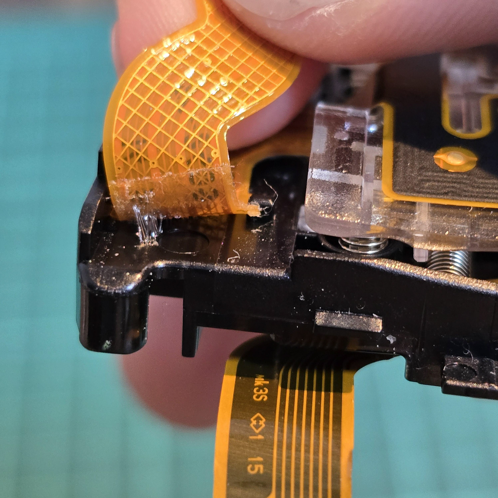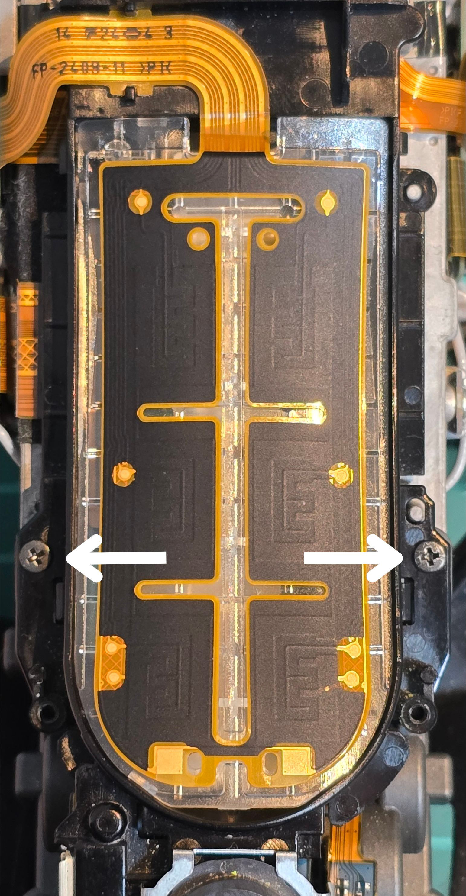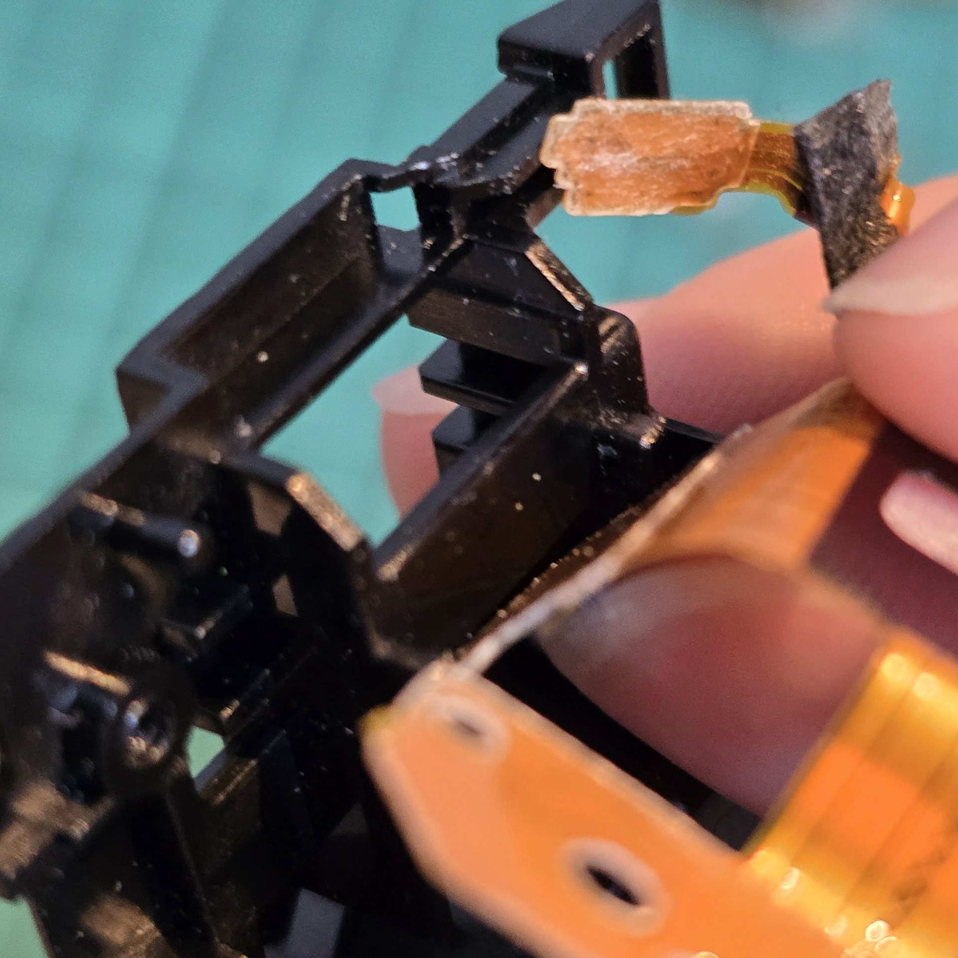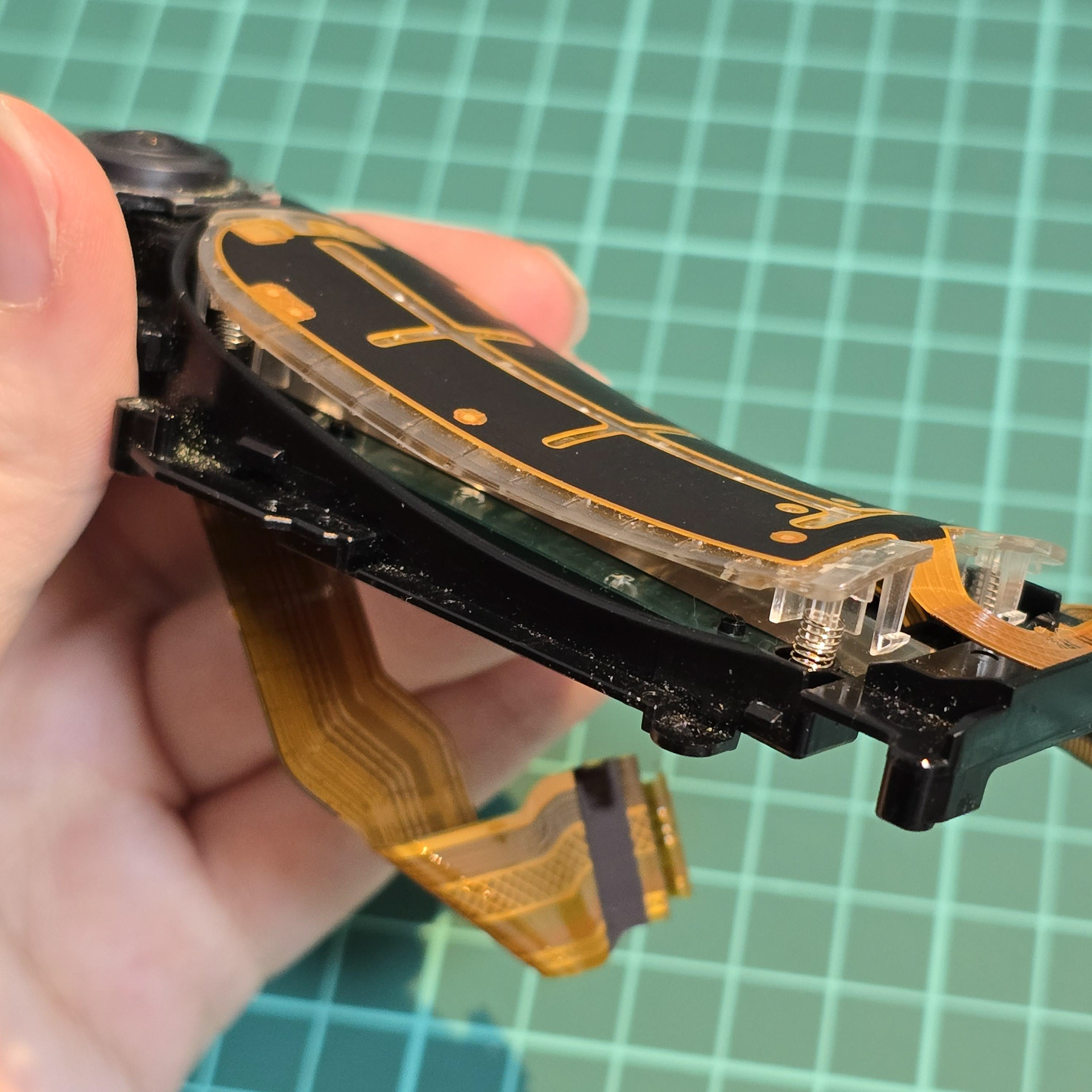 When peeling, be careful of tabs in the middle - make sure to gently unhook the cable from them once you deal with the adhesive. Then, gently lift the back sensor off the black plastic, taking note of the 4 springs underneath. Make sure not to drop/loose them, so keep them in a safe place.