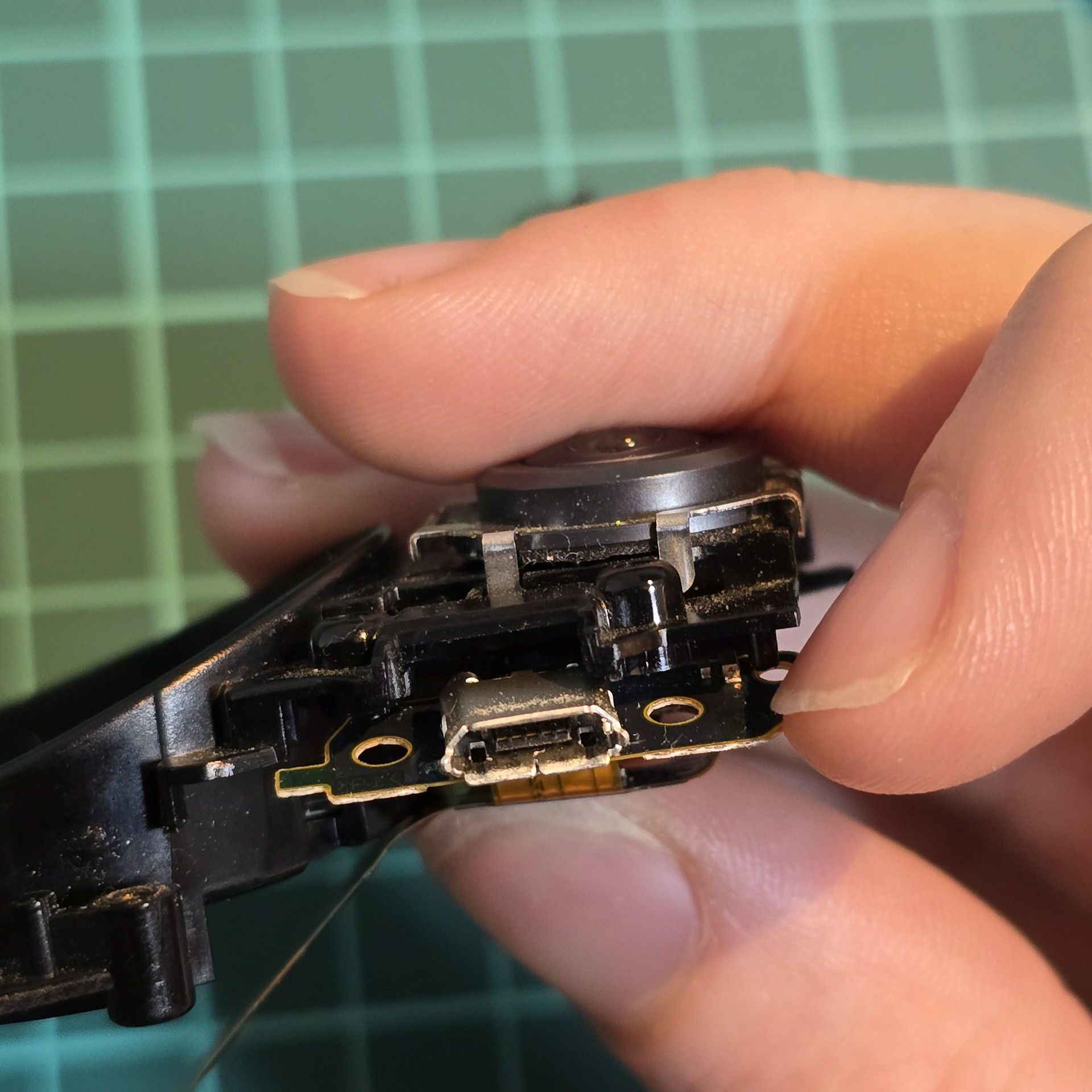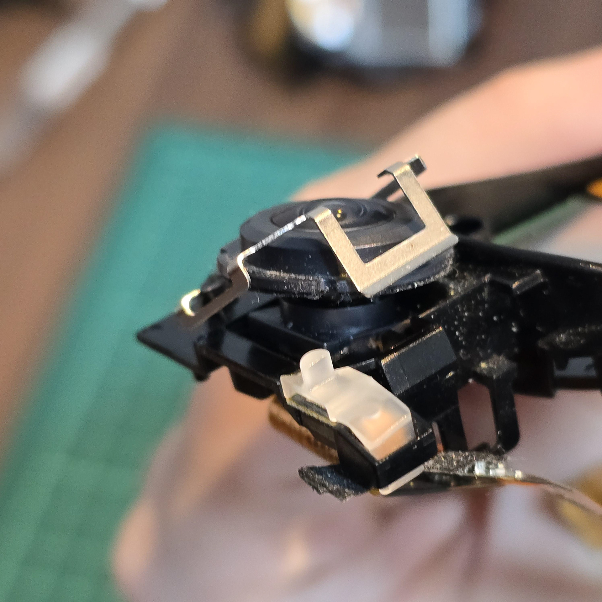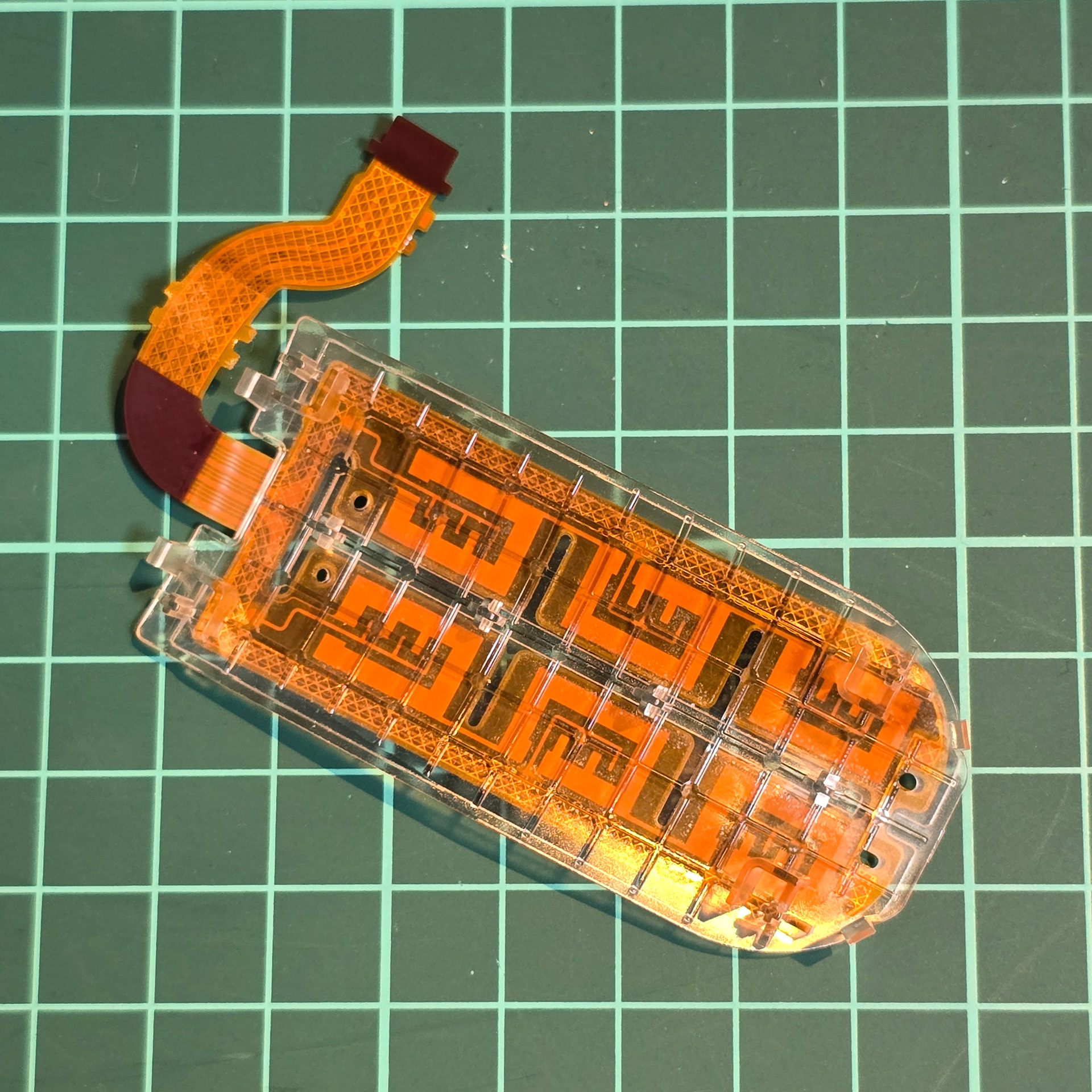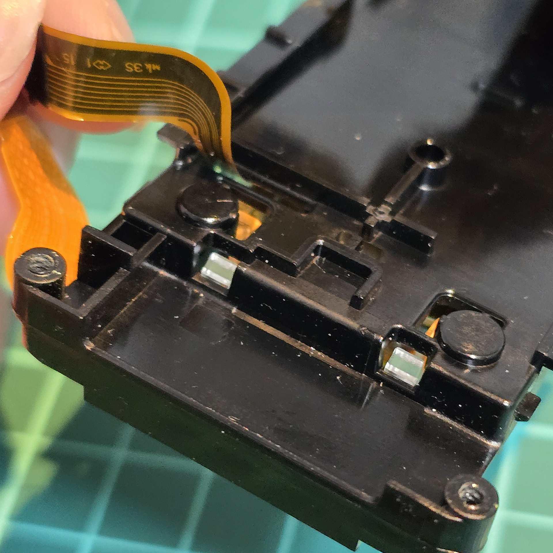 When peeling, be careful of tabs in the middle - make sure to gently unhook the cable from them once you deal with the adhesive. Then, gently lift the back sensor off the black plastic, taking note of the 4 springs underneath. Make sure not to drop/loose them, so keep them in a safe place.