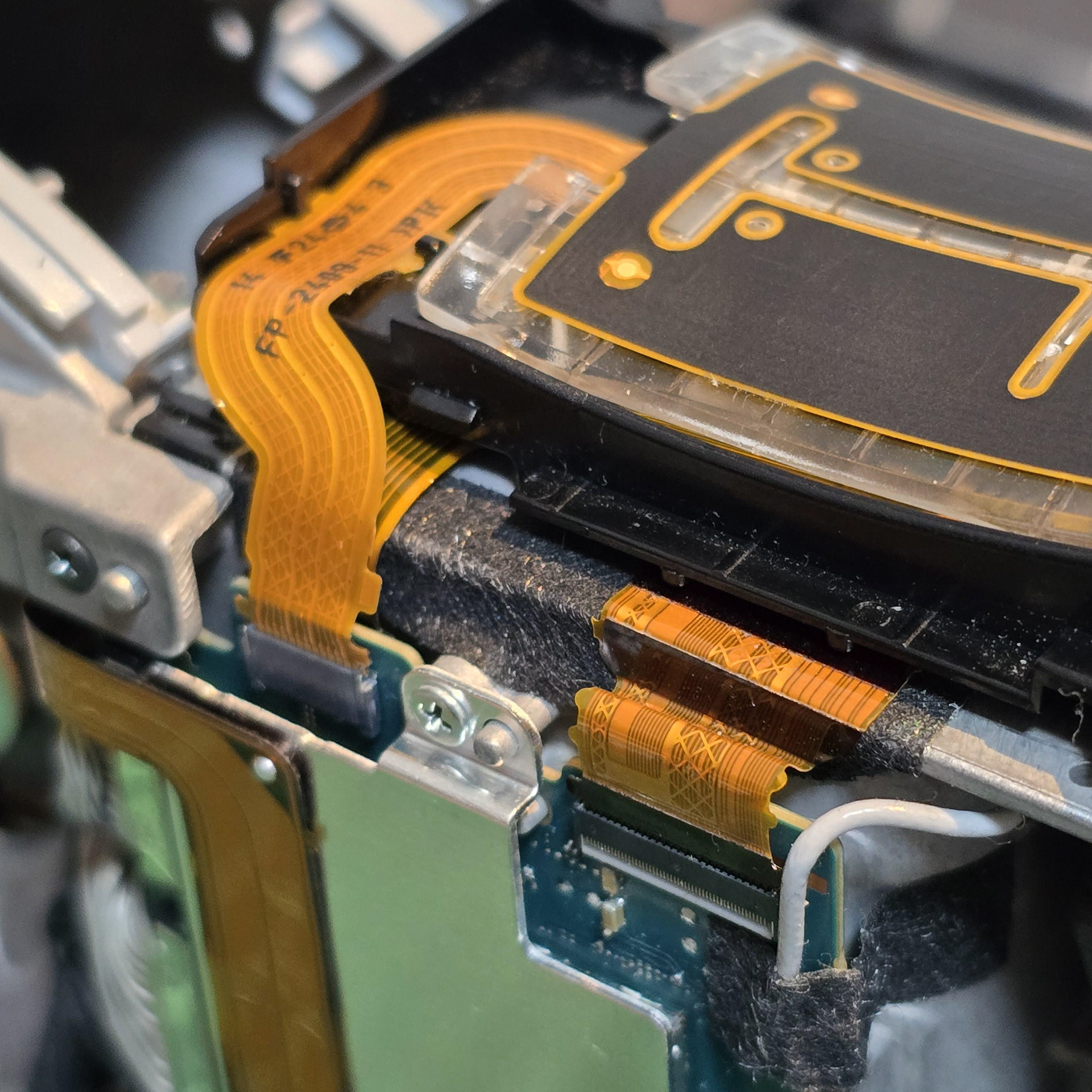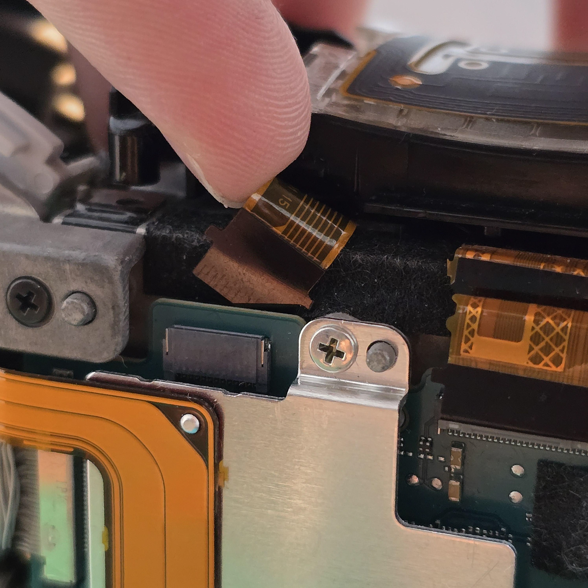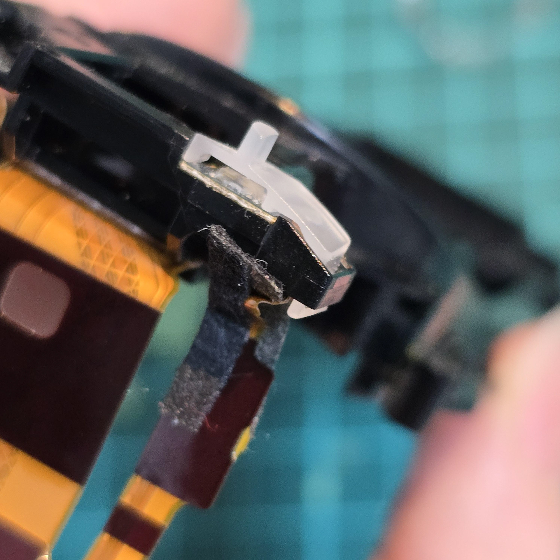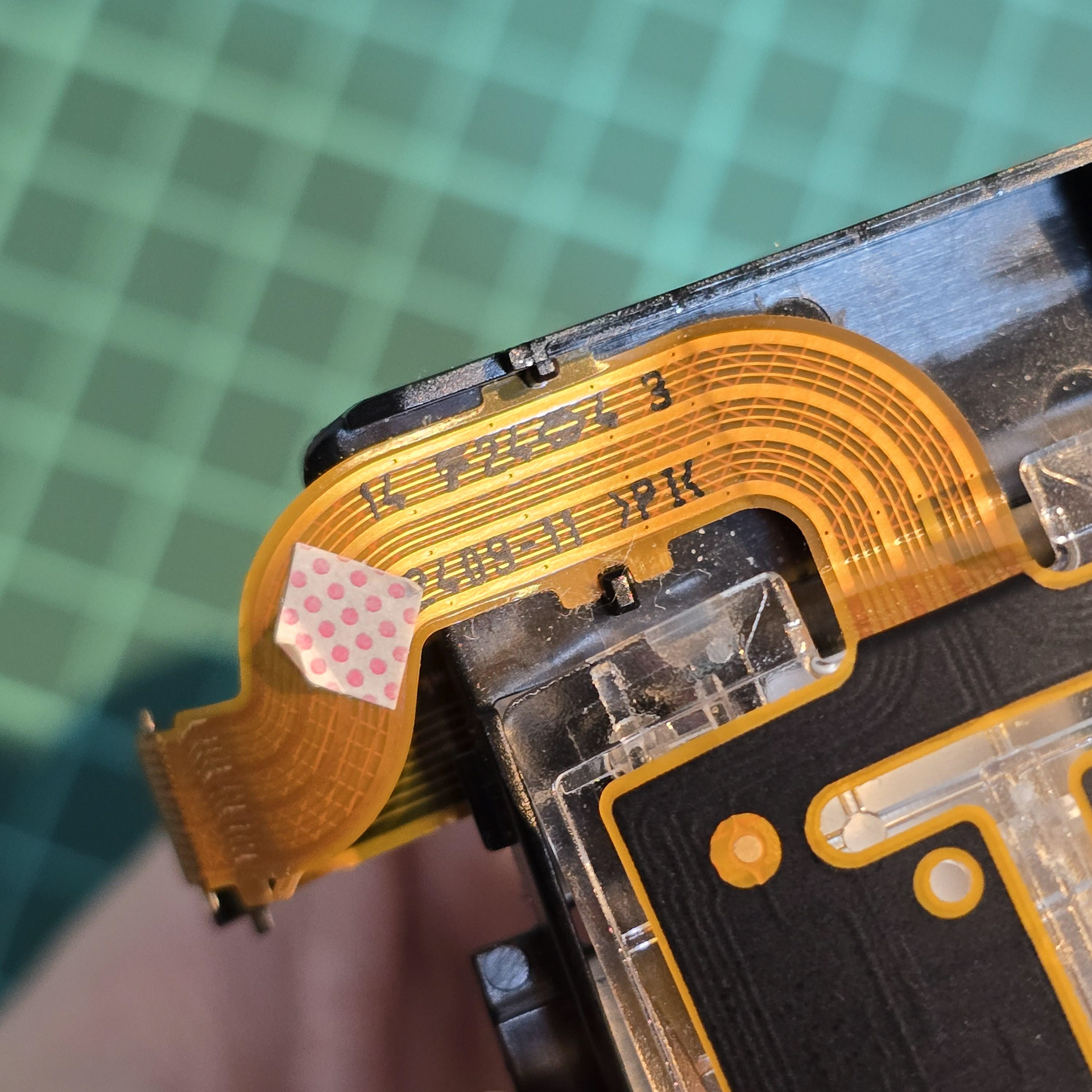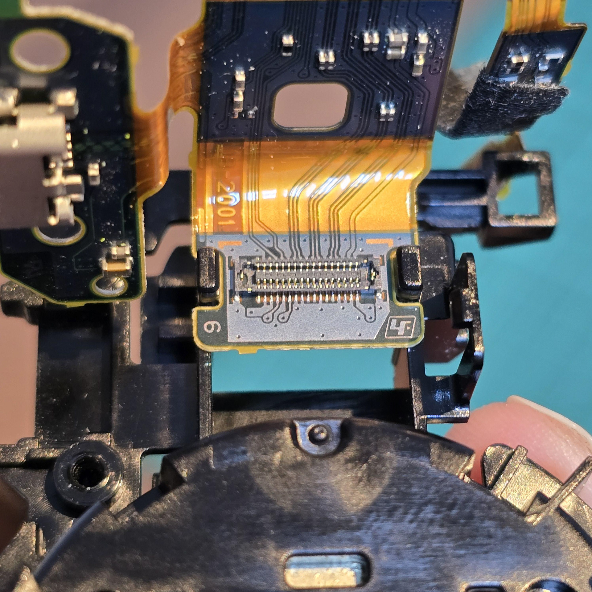 Once all of the clear tabs have been unhooked, turn to the gold flexible cable at the front. This is held down with adhesive tape, so slowly peel it off the black plastic. Ignore the square sticker with pink dots, that is just water indicator paper.