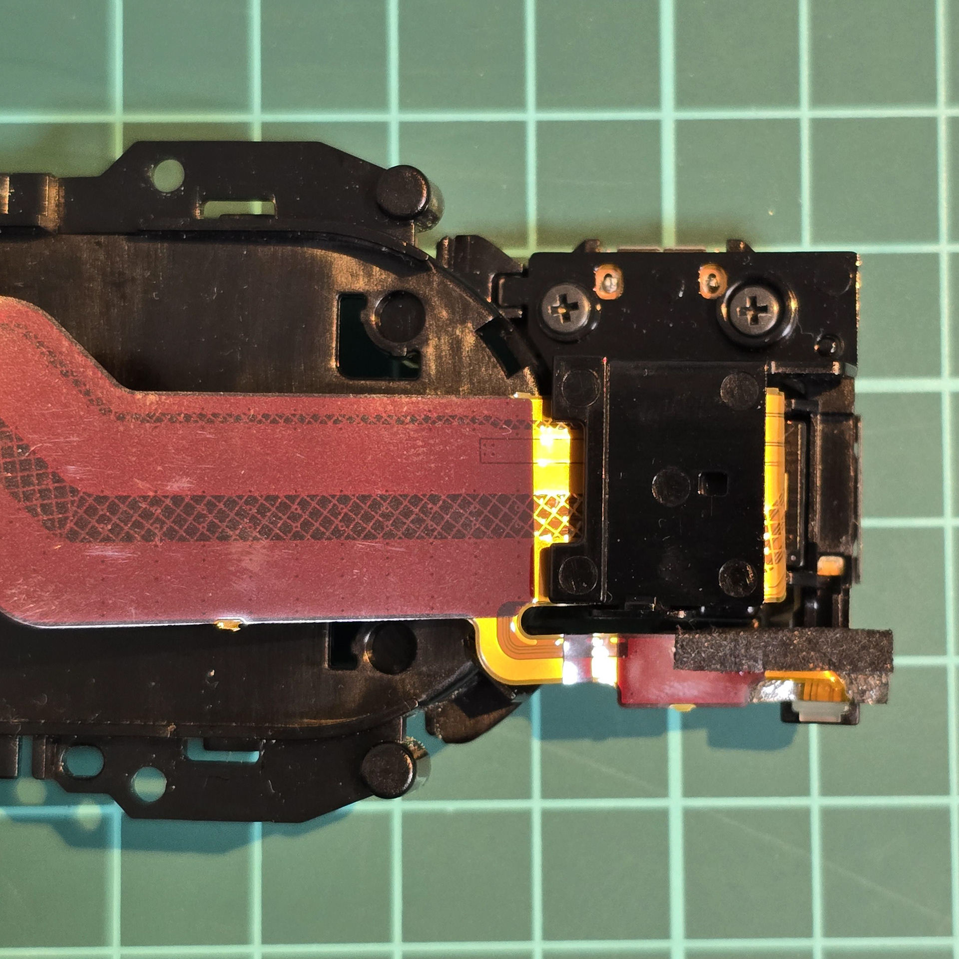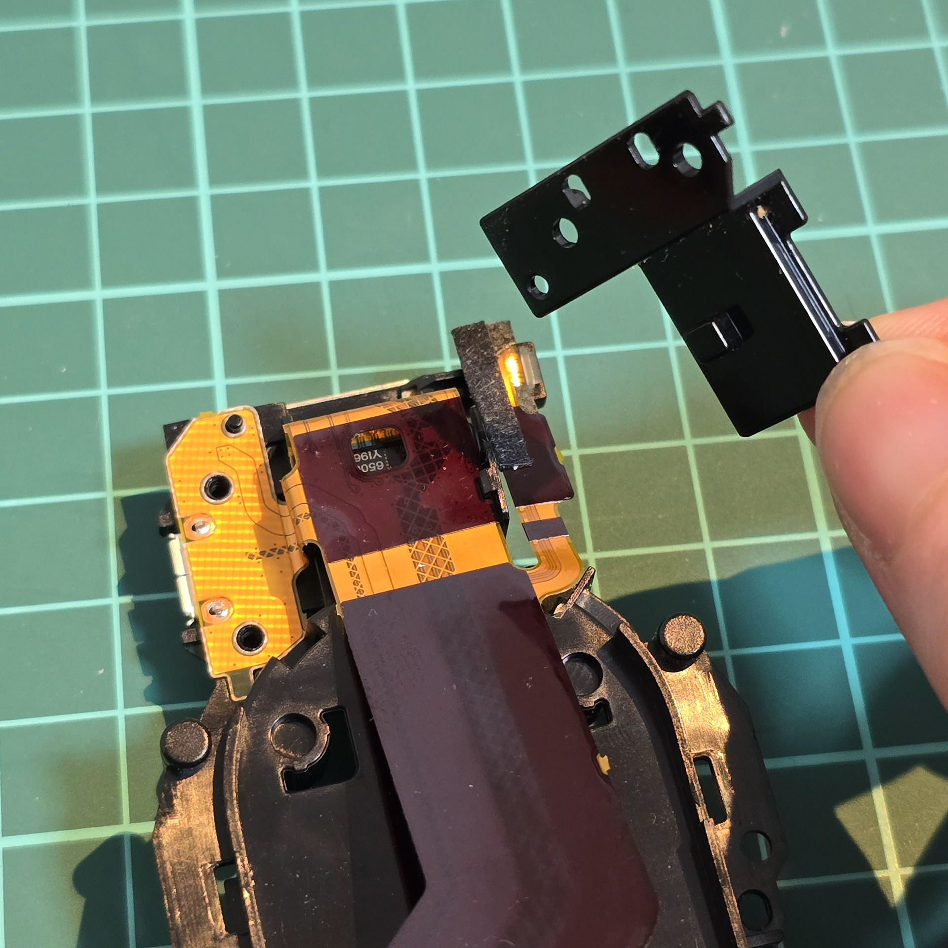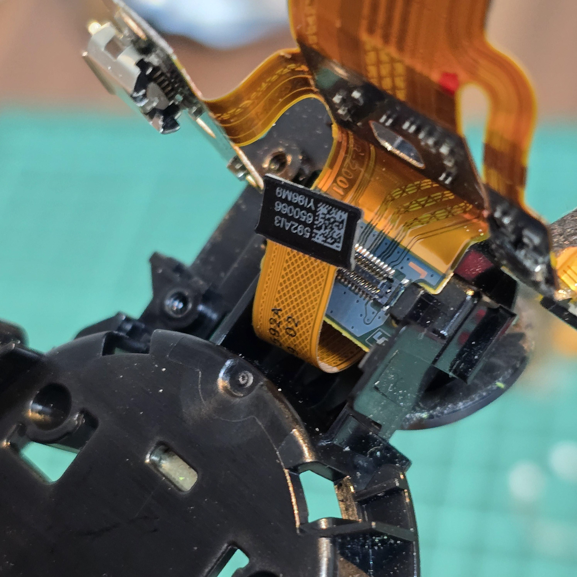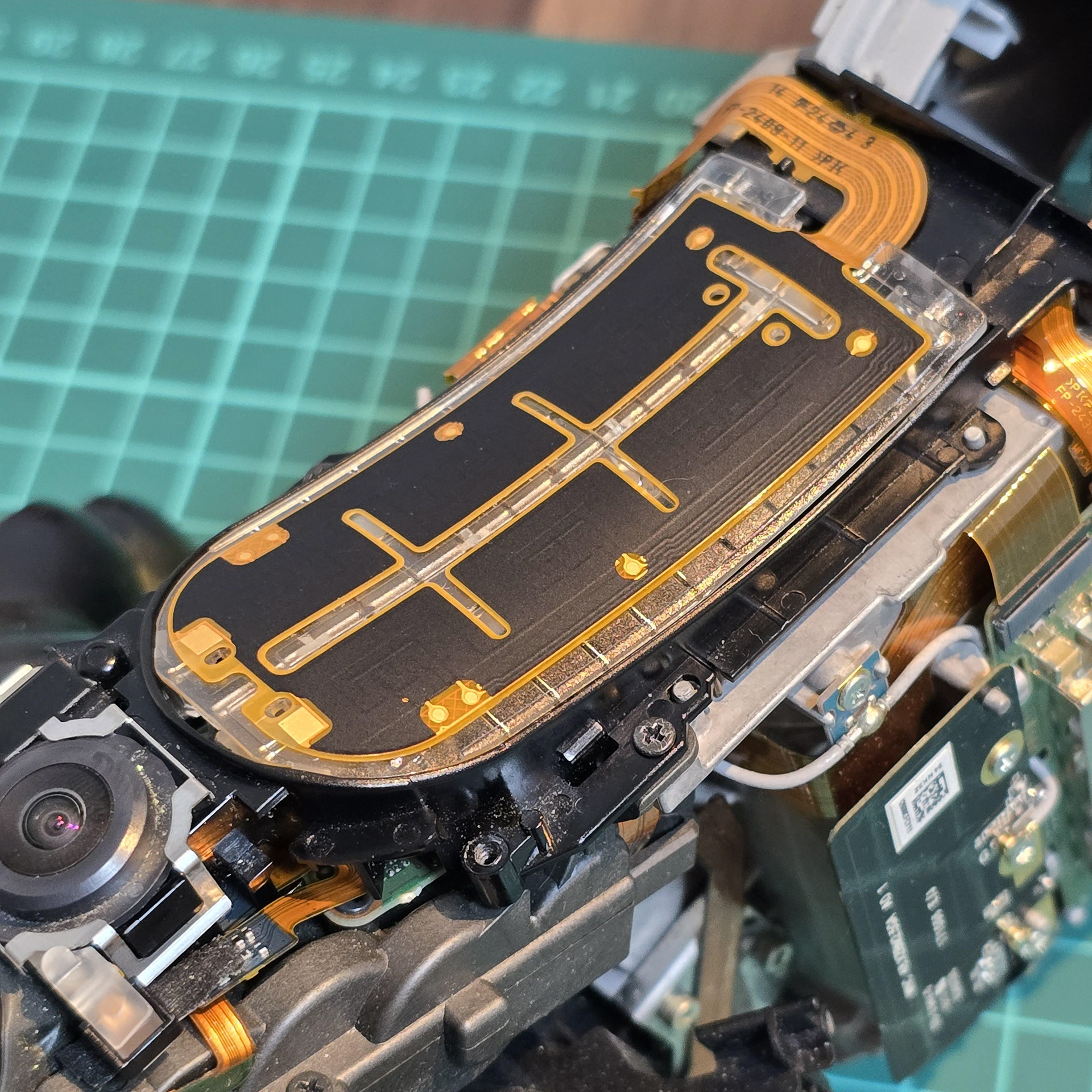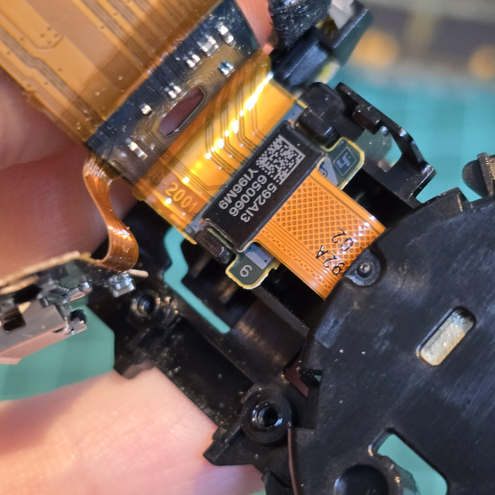 Once all of the clear tabs have been unhooked, turn to the gold flexible cable at the front. This is held down with adhesive tape, so slowly peel it off the black plastic. Ignore the square sticker with pink dots, that is just water indicator paper.