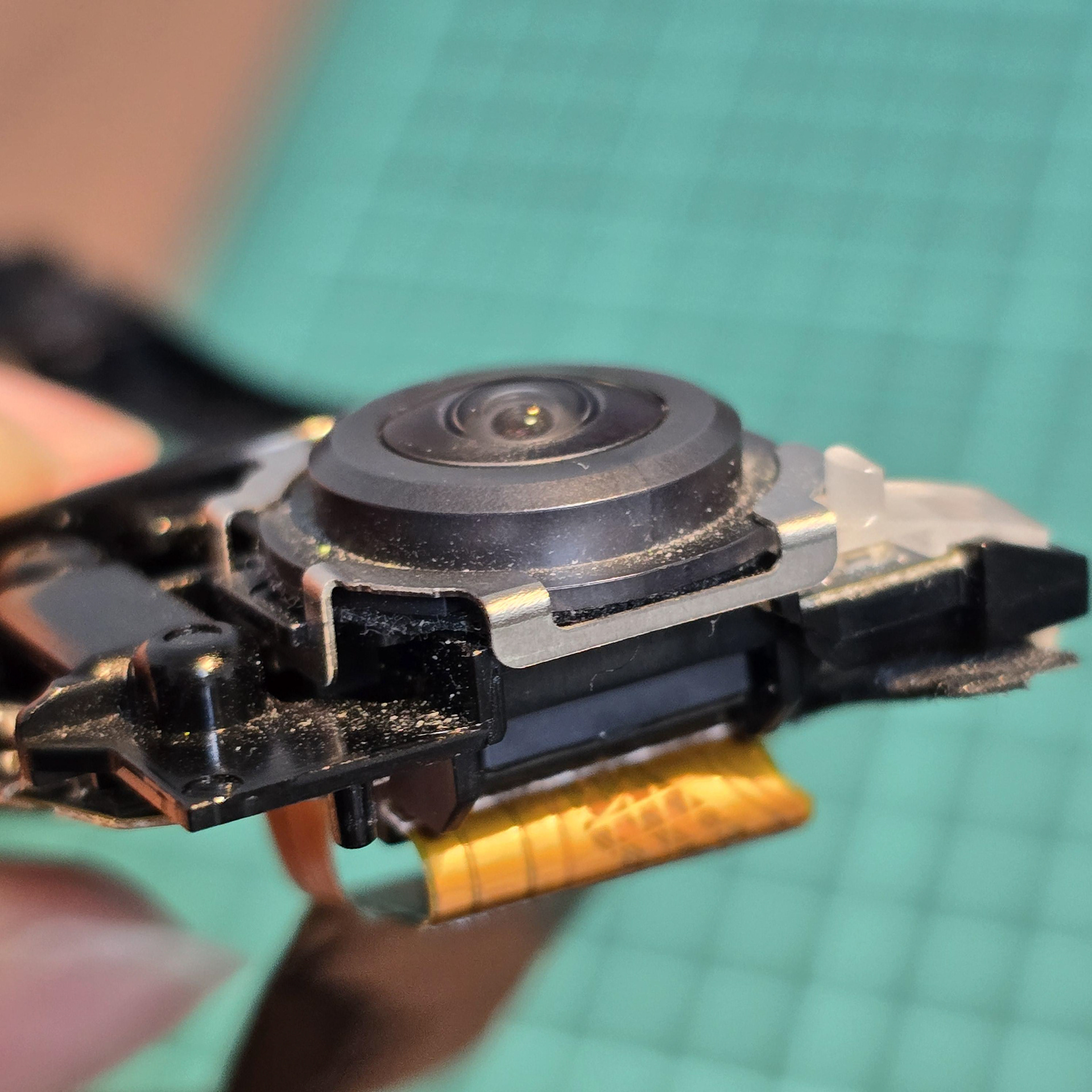 Next we will remove the camera. Firstly, pull the metal bracket from around the camera lens. It pulls off once you flex it.