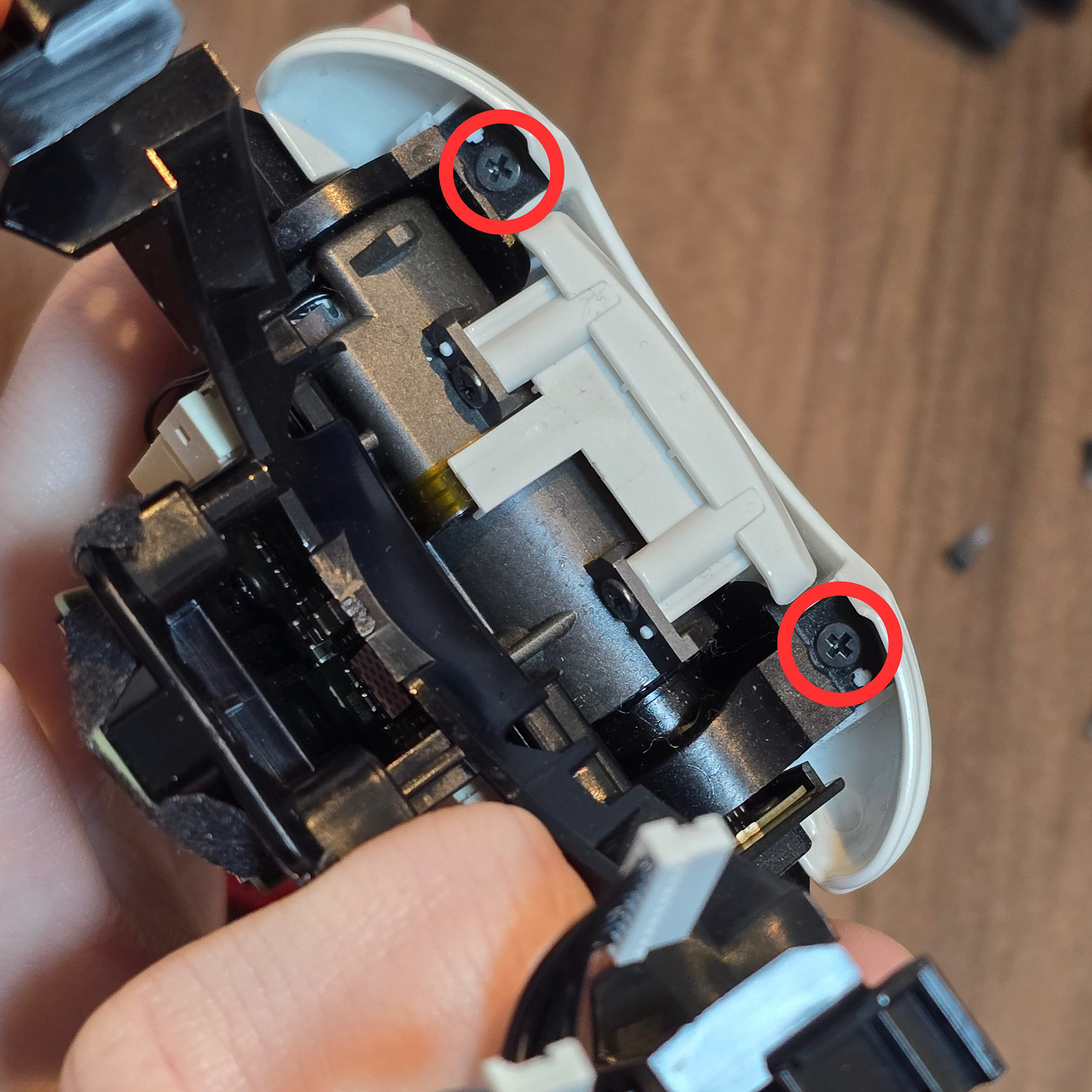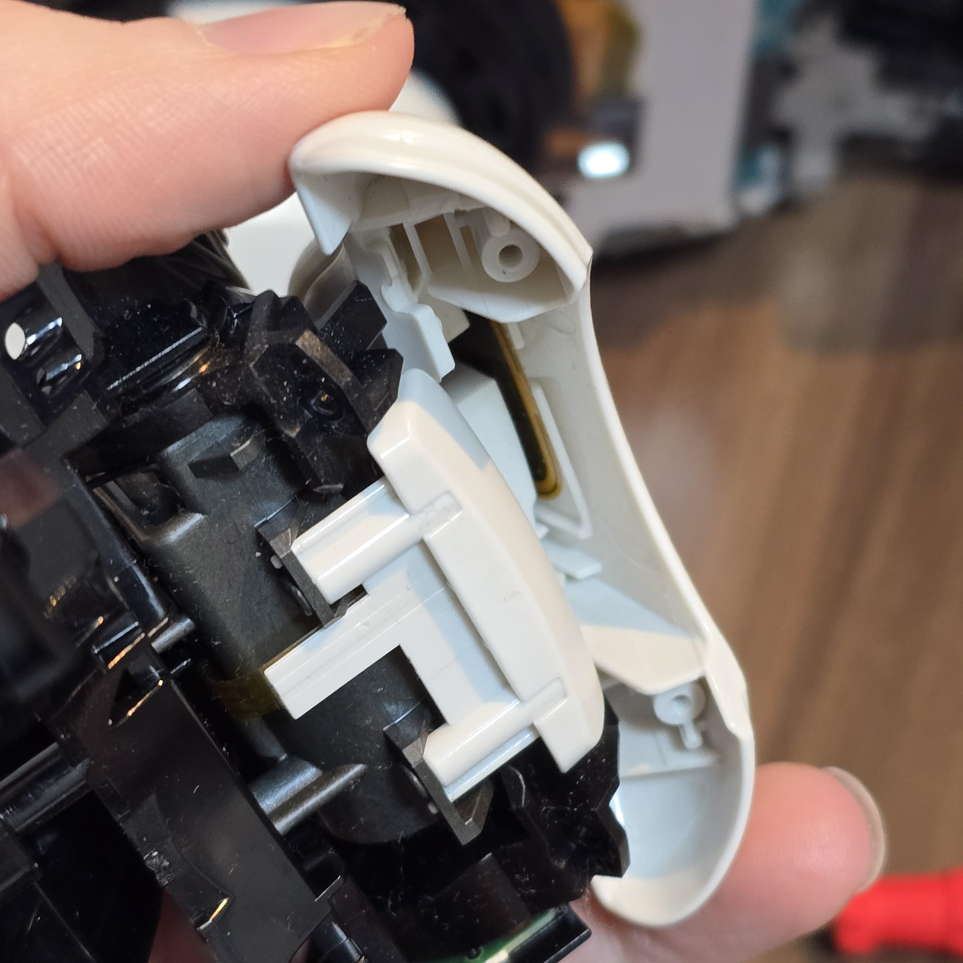 口のプラスチック部分を顎の残りの部分に固定している黒いネジが2本あります。両方のネジを外すと、顎のプラスチック部分が外れます。下顎を少し外側に動かしますが、顎センサーのフレキシブル基板につながるフレキシブルケーブルを介してメインの顎部分に接続されていることに注意してください。