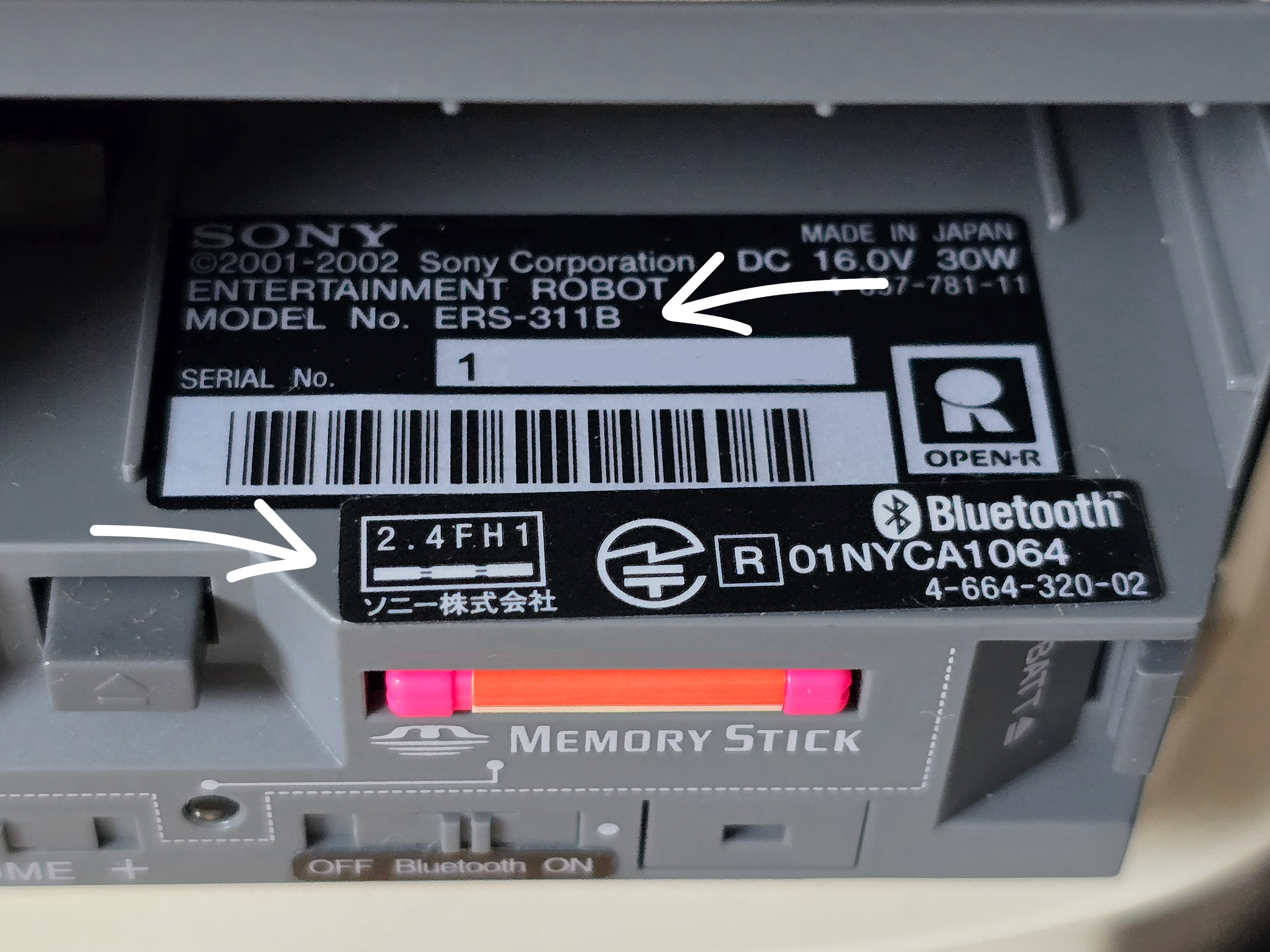 各aiboのバッテリーベイ内部には、シリアル番号のステッカーが貼られています。Bluetooth搭載モデルの場合は、「ERS-311B」または「ERS-312B」、あるいは「ERS-311B/X」と記載されています。また、シリアル番号ステッカーの下に、Bluetooth適合性を示す別のステッカーが貼られています。