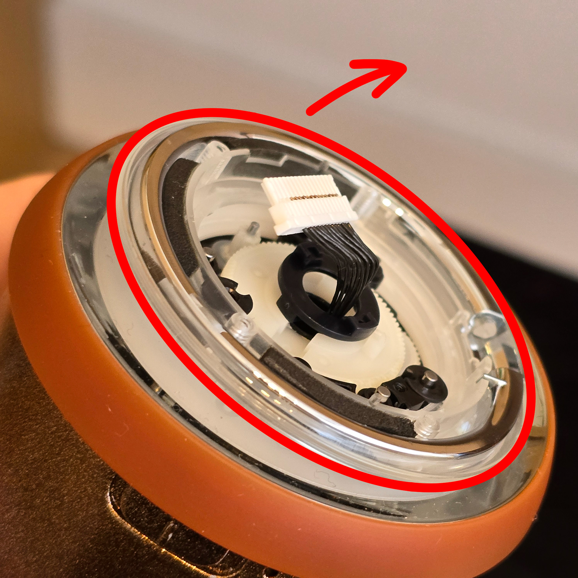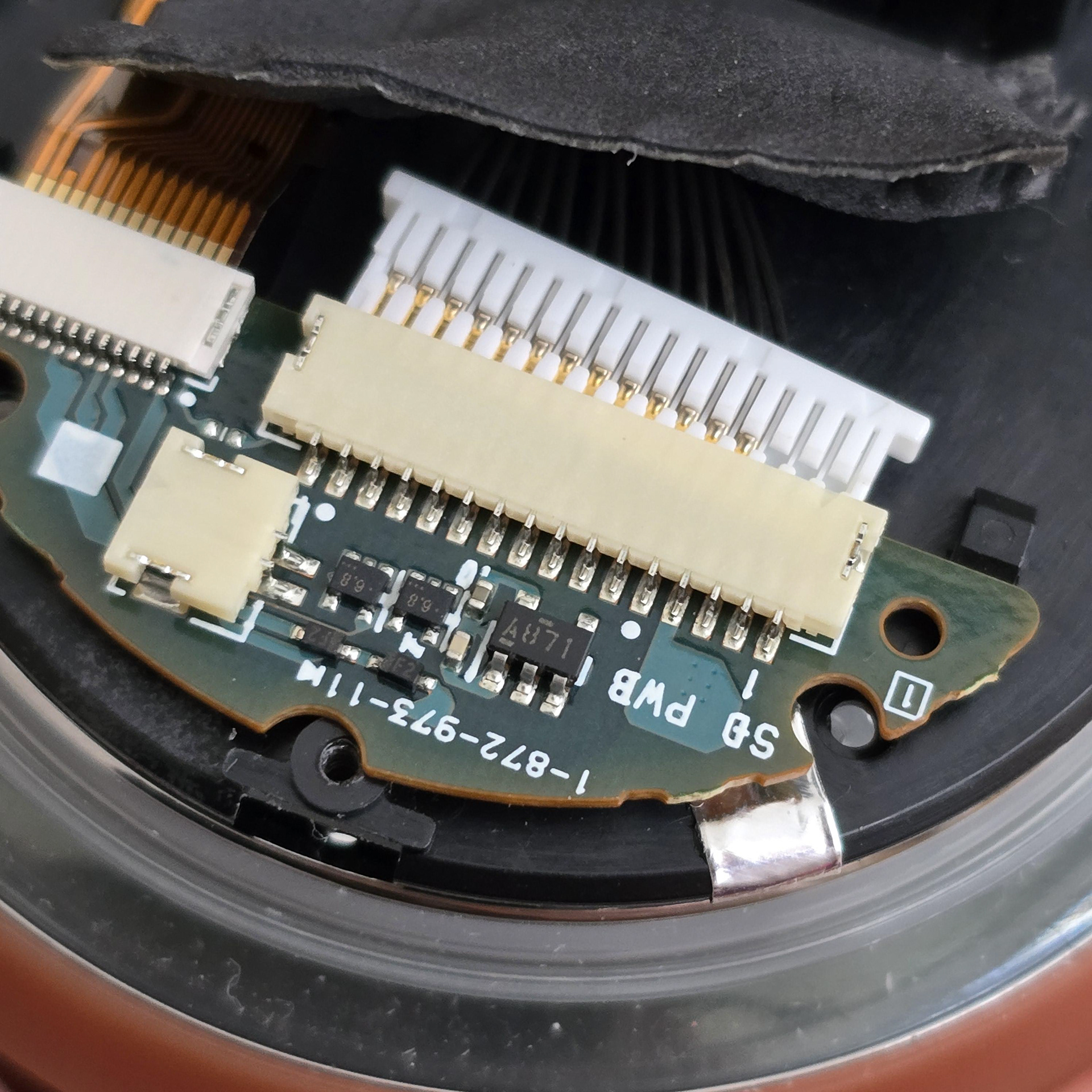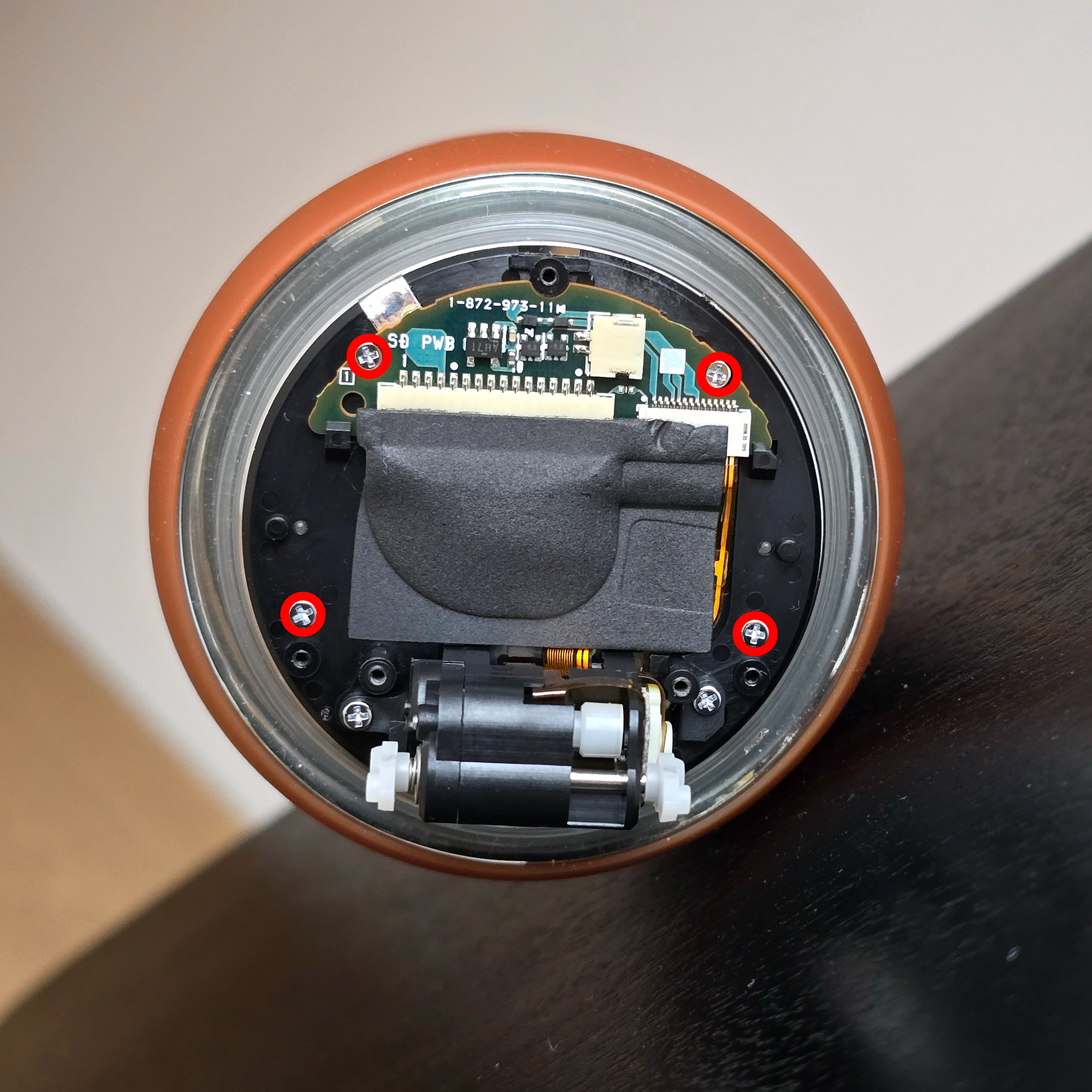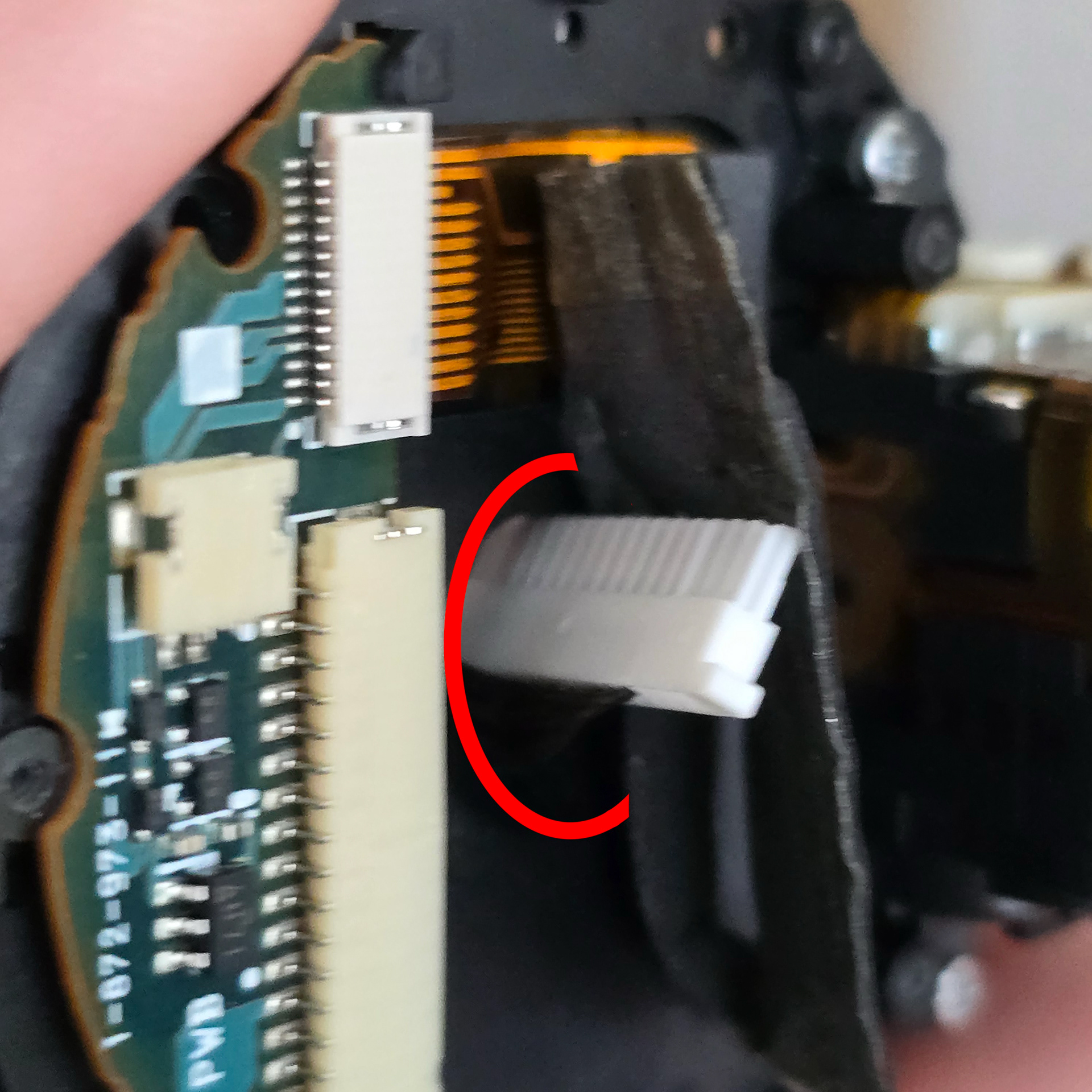 最初の写真で丸で囲まれた4本のネジを外します。次に、フォームシールを慎重に剥がします。このシールは破れやすいですが、大きな問題にはなりません。次に、長い白いコネクタを外します。