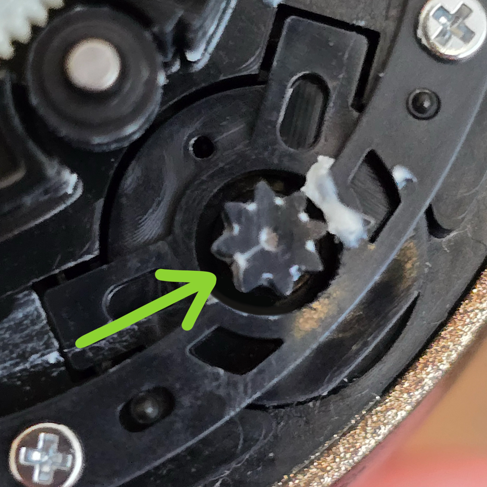 Rollyのタイヤが取り付けられているホイールレイヤーを持ち上げて取り外します。スペーサーを落として緩めないように注意してください。これを外すと、ピニオンギアがはっきりと見えます。よく見ると、そこに線(またはそれ以上)が走っているのが見えるはずです。これが亀裂です。