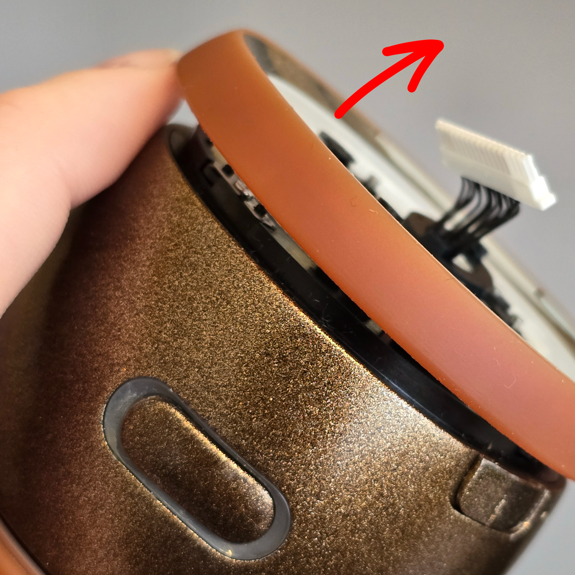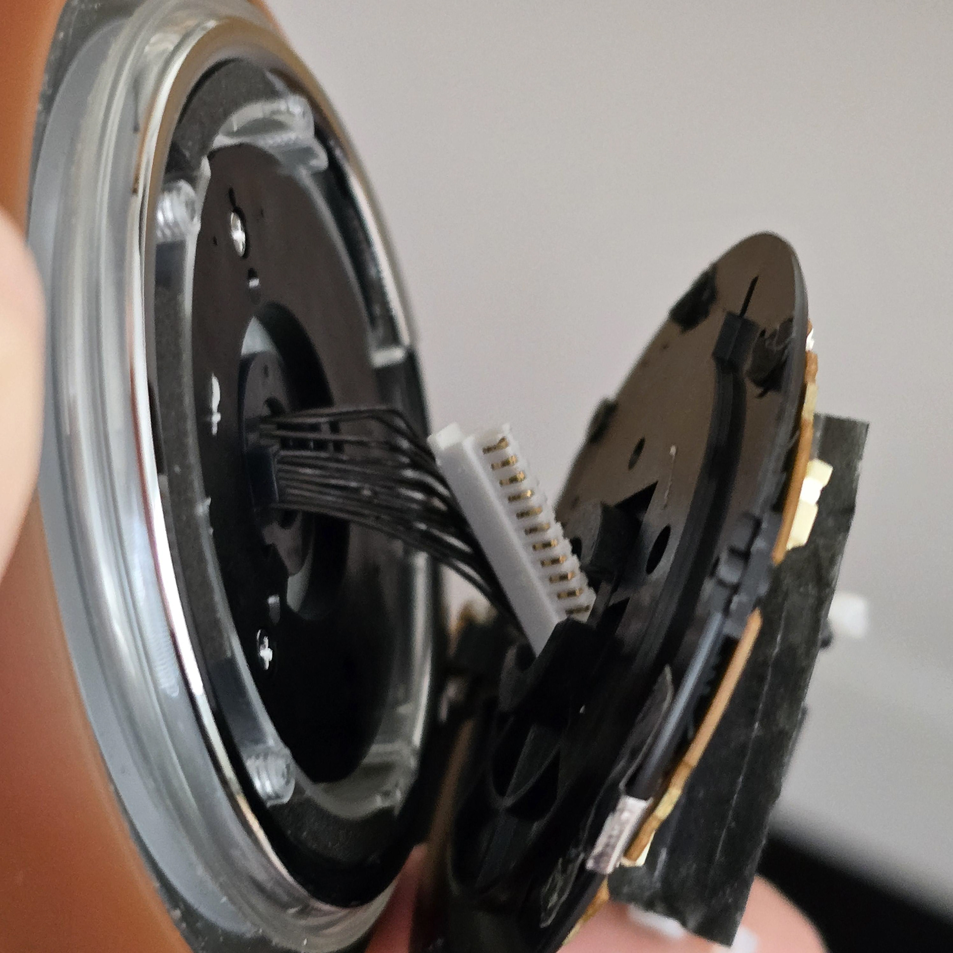 長いコネクタを中央の穴に横向きに差し込みます。そうすることで、回路基板が入った黒いプラスチック層が本体から取り外せます。取り外せたら、銀色のネジ3本を外します。