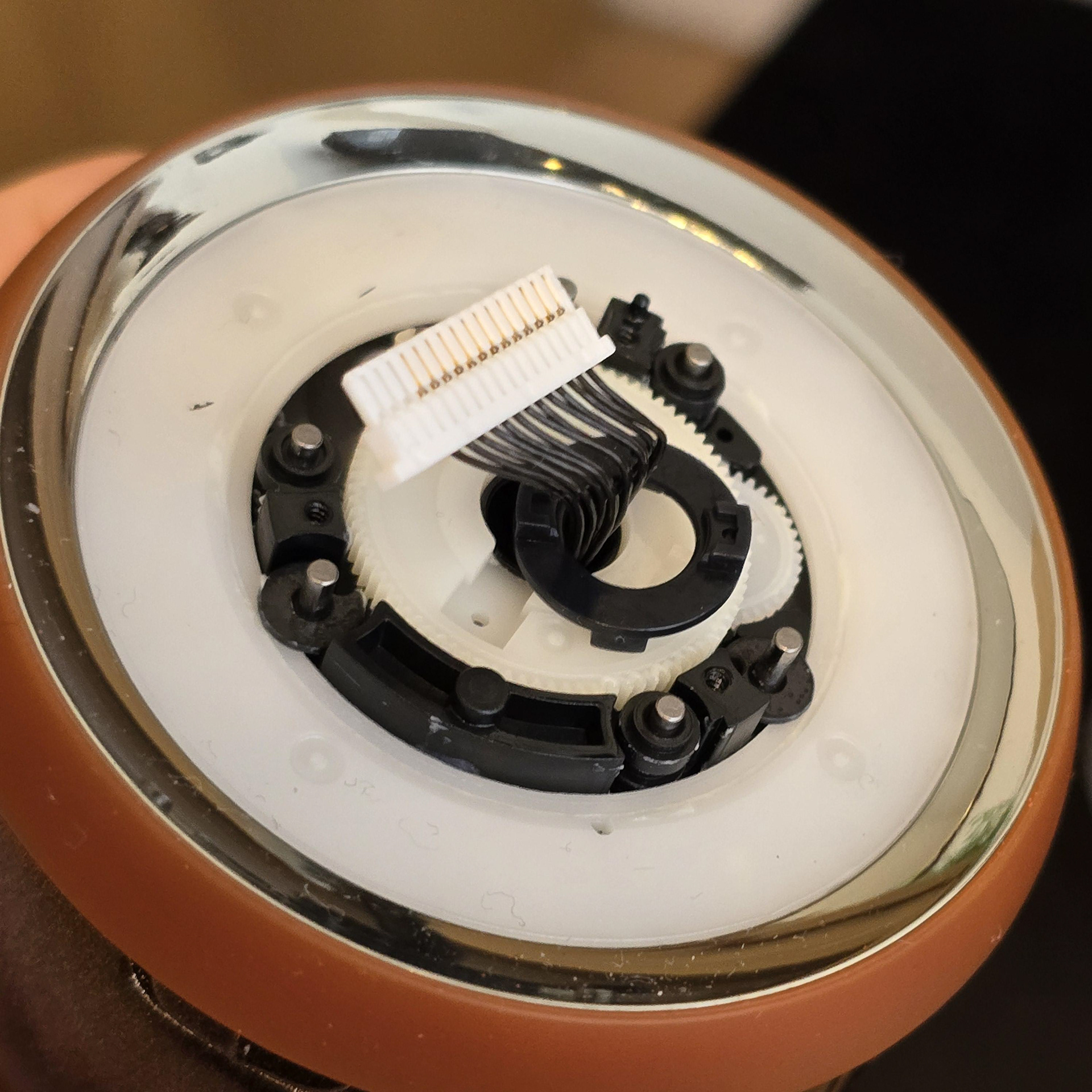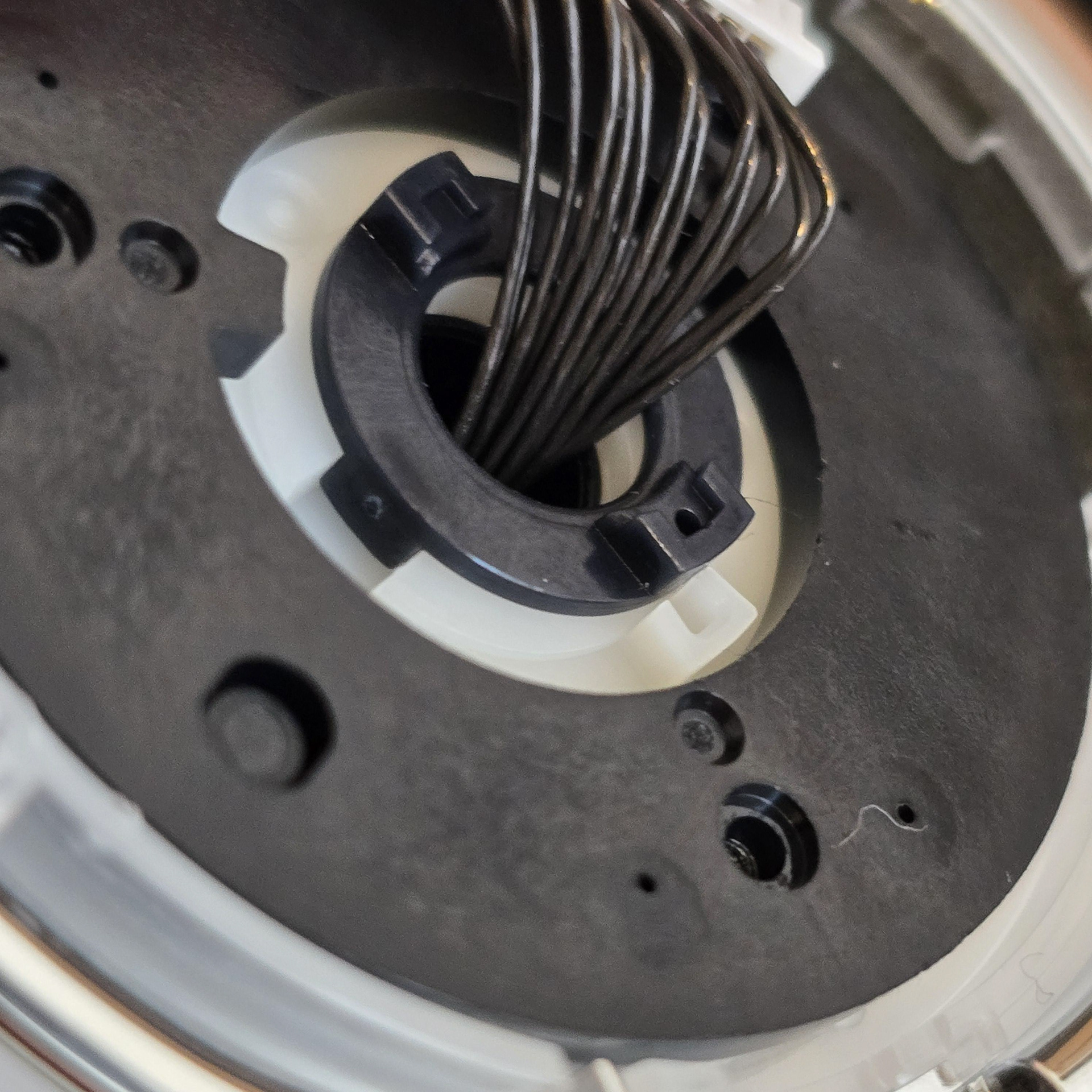 ネジを外したら、黒いディスクを持ち上げて取り外すことができます。これで、Rollyのホイールを構成する2層のうちの最初の層が現れます。これらを取り外す際は、小さなスペーサーを落としたり紛失したりしないように注意してください。再組み立てに不可欠なためです。ホイールディスクをゆっくりと持ち上げ、スペーサーと一緒に近くのトレイに置きます。