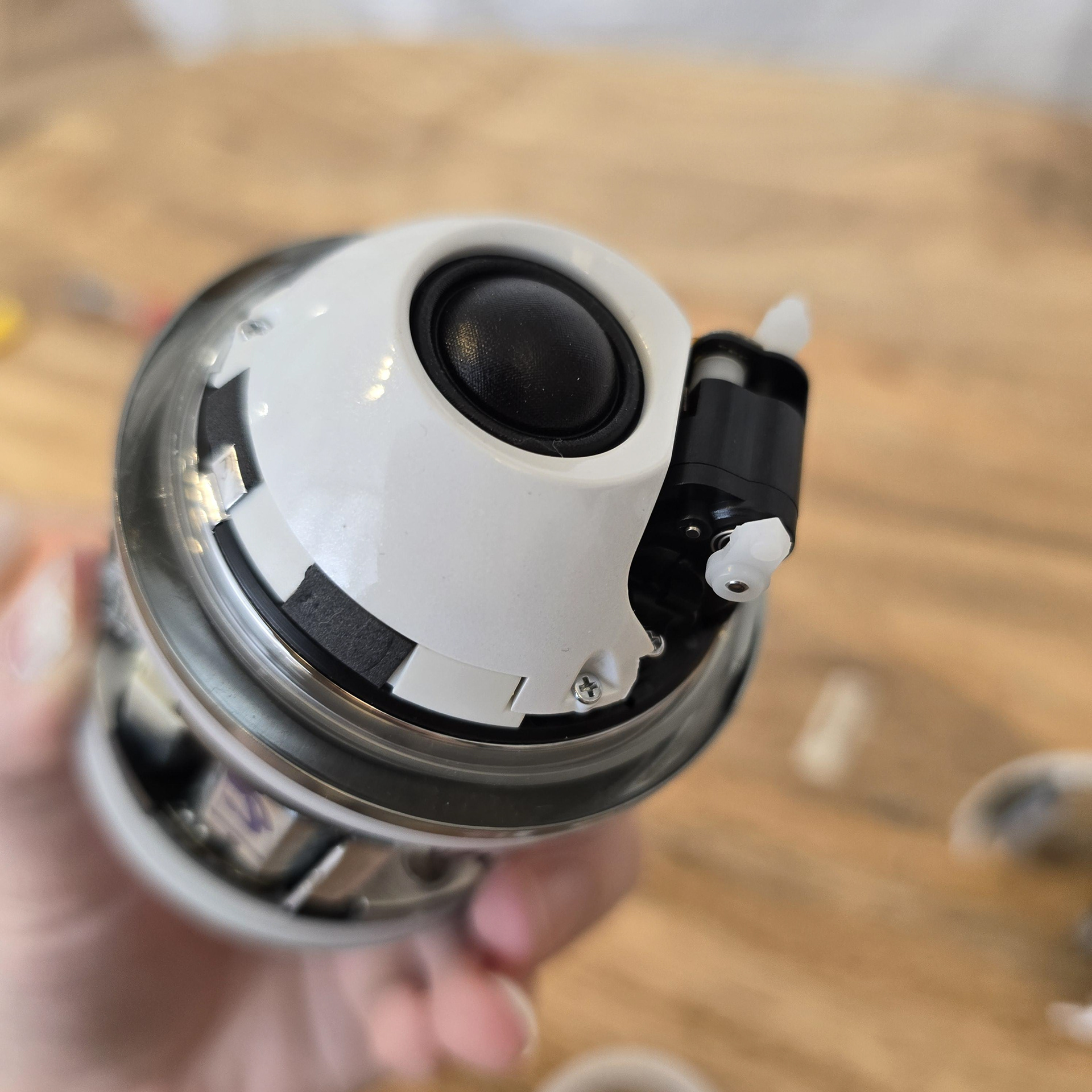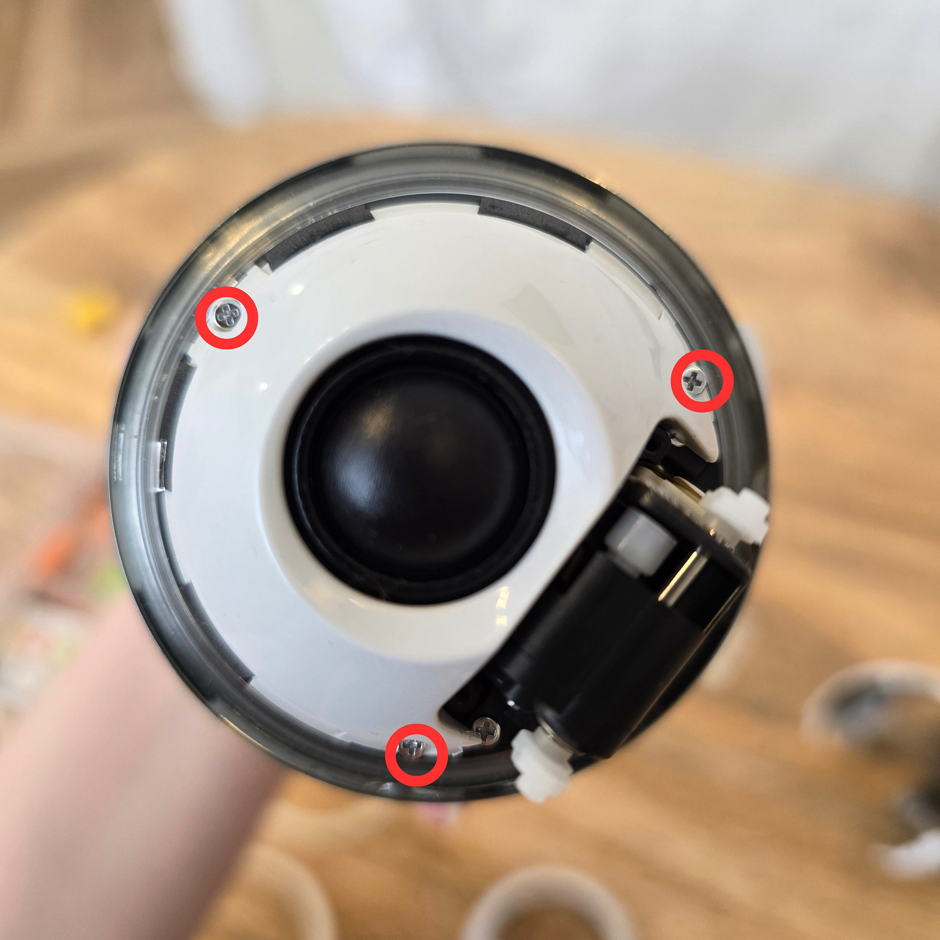 スピーカーモジュールを取り外します。3本のネジを外してください。ネジを外すとスピーカーを持ち上げられるはずです。スピーカーは黒いプラスチック部分の基板に接続されているので、プラグを抜いて取り外してください。